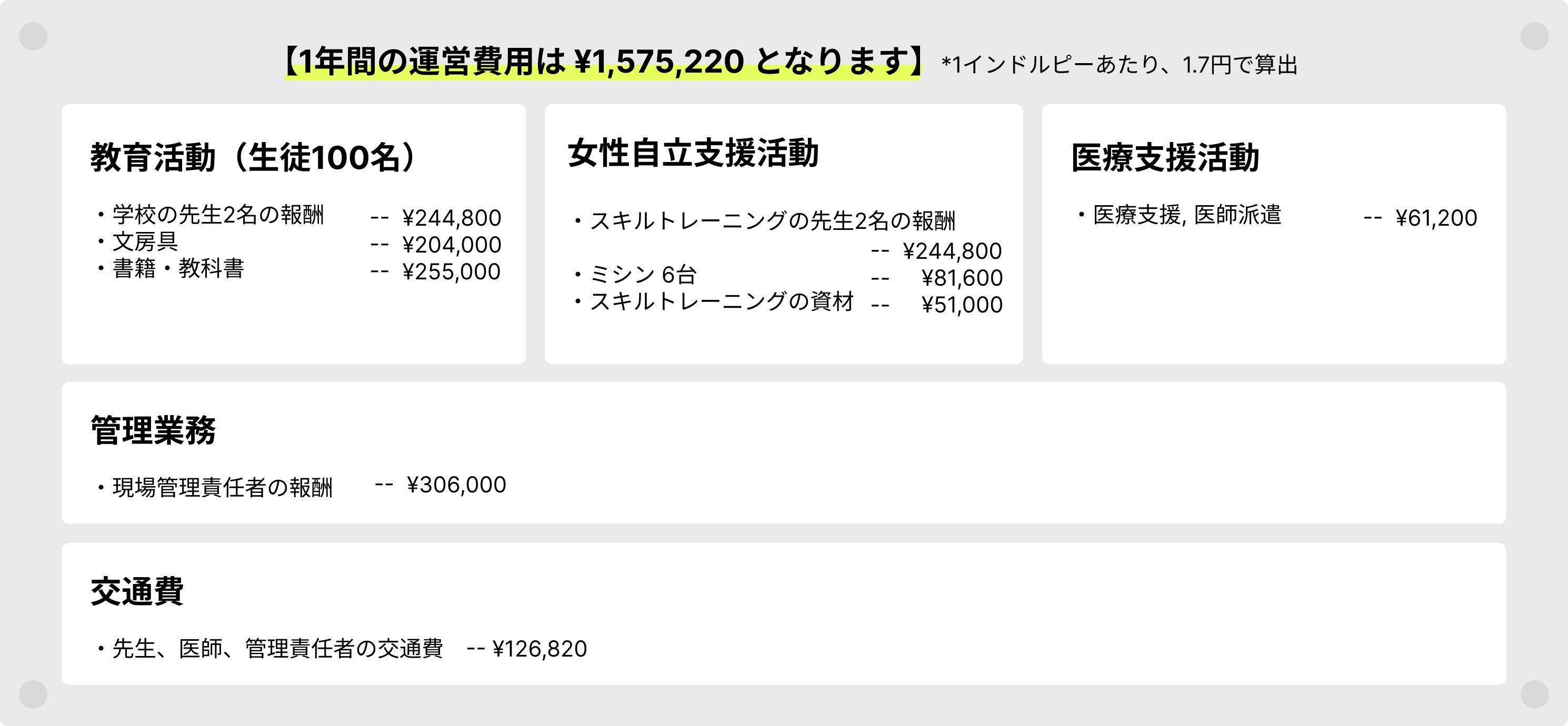 建設費は株式会社アドベンチャーによって全額支援していただけることが決まりました。しかし、このプロジェクトを本当に村の【永続的な希望】にするには、優秀な先生たちへの報酬、子どもたちの学用品、医療スタッフの配置、リキシャーの運営といったランニングコストが継続的に必要です。毎年発生するこの費用なくしては、どれだけ立派な建物も、やがて機能停止してしまいます。