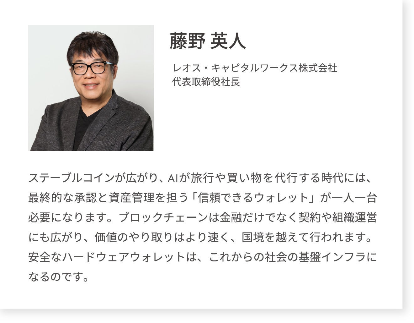 日本のセキュリティ専門家が設計し、すべてのコードに責任を持ち、日本語の画面と日本語のサポートで届ける。暗号資産の署名からパスキー認証、スマートカード認証まで、デジタル社会のあらゆる認証を一台で守れるデバイスを、この国から世界へ発信する。