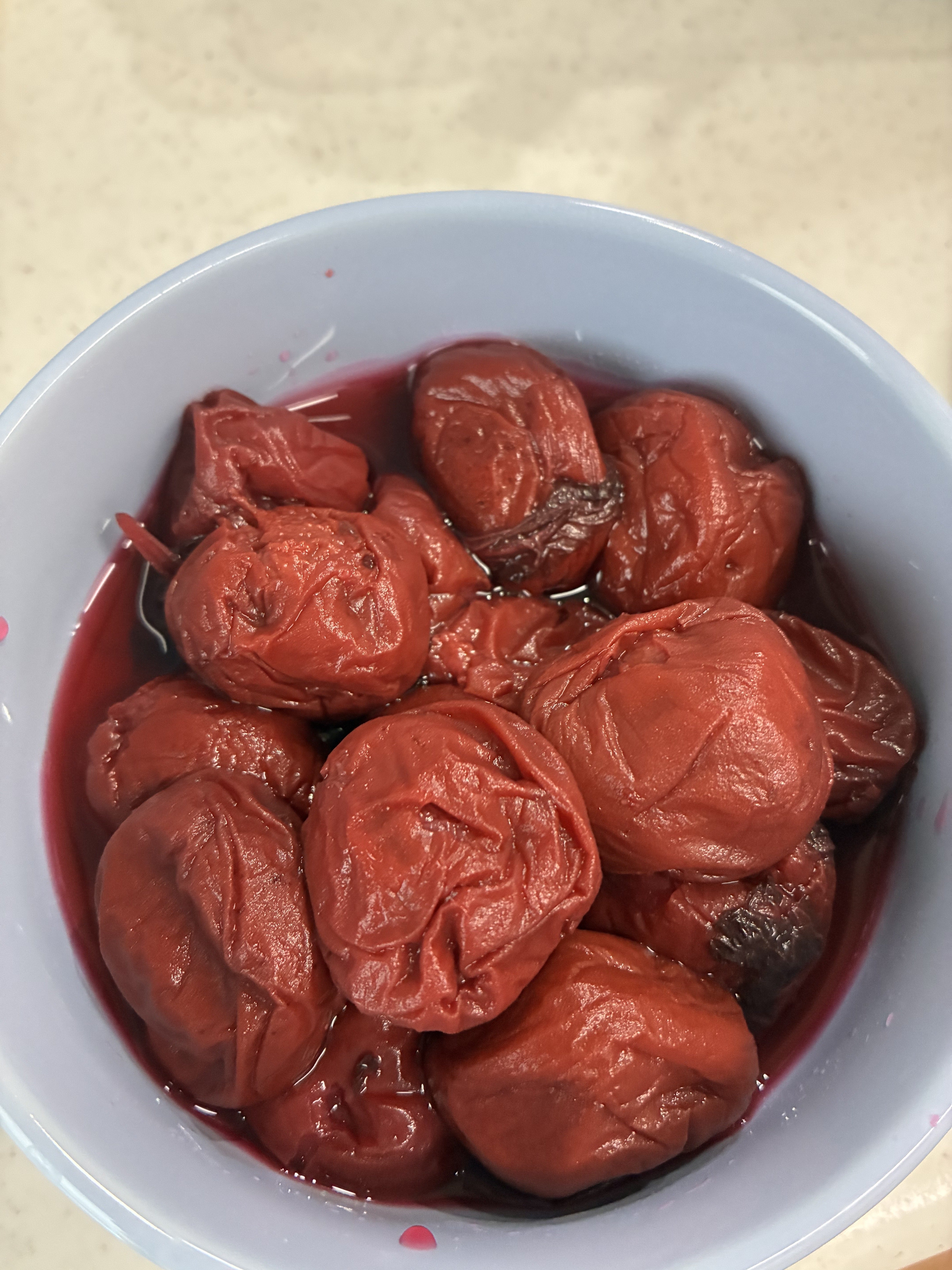 毎年、家に実る梅を採取し漬けています。祖母の代から続く自家製梅干しはすっぱくておいしいです(^^♪(3年〜5年漬けた梅干)