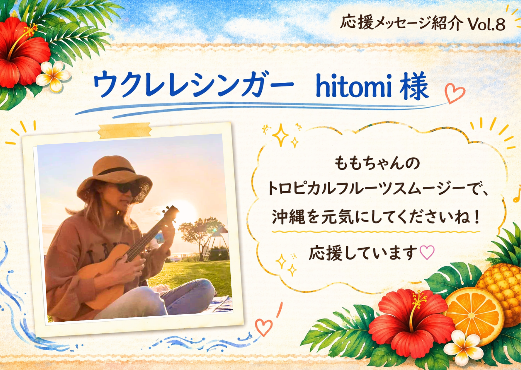 ゆくるばスクールの仲間、ウクレレシンガー hitomi様から応援メッセージをいただきました!
