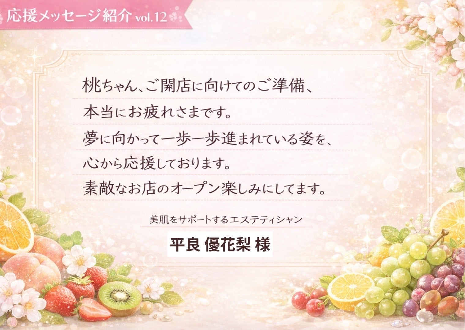 2026/04/20 20:16美肌をサポートするエステティシャンの平良優花梨様より、温かい応援メッセージをいただきました!私自身もスムージーを通して、内側からの健康と美しさを届けられるお店も目指しているので、共通する想いを感じ、より一層頑張ろうと思えました。Openに向けて全力で頑張ります!本当にありがとうございます!引き続き応援よろしくお願いいたします。 もっと見る