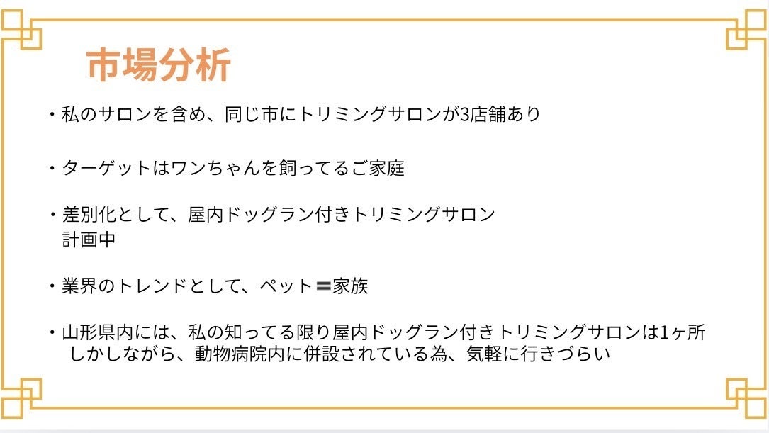 ・現在、私は扶養に入っており、収入は8〜10万程度です。これからの動きとして、ご紹介プランを立て、ご新規様を増やしていく。トリミング(シャンプー)はワンちゃんの為にも1ヵ月〜2ヵ月が理想的なので、次のご予約もいただく様にしていく。