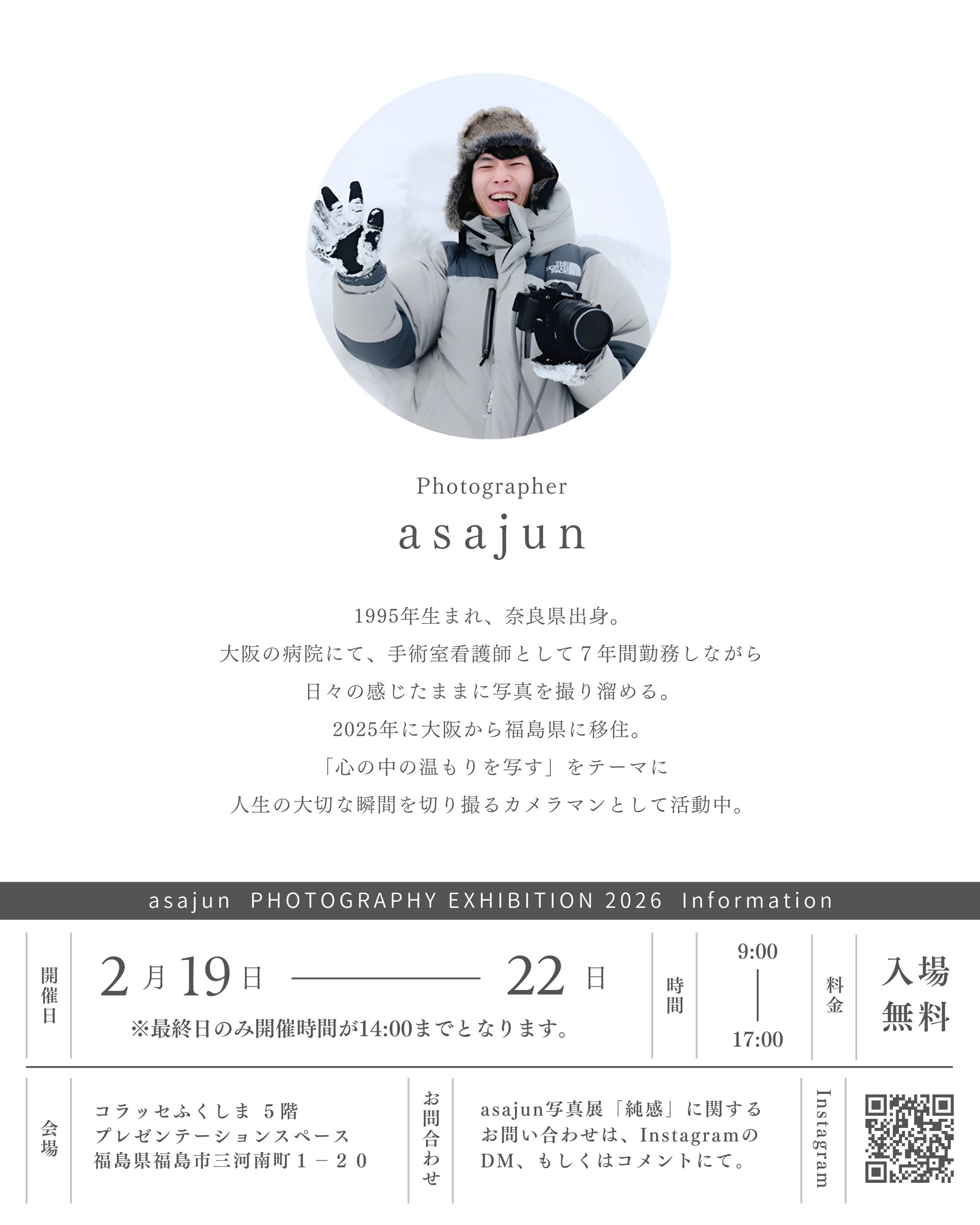 2026/02/24 09:50みなさん、こんにちは。Photographerのasajunです。2月19日〜2月22日、4日間の初個展が無事終了しました。ご来場いただいた方は約130名。本当にありがとうございます。2025年10月に福島へ移住。その時の人脈は、たったの2人。そこから130名もの方に来ていただけたこと、正直、自分が一番驚いています。今回の会場は約90平米。しかも5階。決して人通りが多い場所ではありませんでした。移住してから展示開催まで、・自分の足で会いに行く・紹介してもらえるようお願いする・新聞掲載をお願いする・展示ハガキを置いてもらえないかお願いする本当に、あの手この手で動き続けました。その結果、多くの方の手助けと協力のおかげで、予想を大きく上回る、大大成功となりました。本当に感謝しかありません。実際の展示空間の写真をお見せします。今回は会場が広かったこともあり、いろいろな展示方法に挑戦しました。来てくださった方に、・最後まで飽きずに・一枚一枚じっくり見てもらえるようにそして、僕のテーマである「心の中にある温もりを写す」このテーマが自然と伝わるよう、レイアウトを考えました。「なぜか心があたたまる」「なんだか癒やされる」そんな気持ちになってもらえていたら嬉しいです。写真では伝わりにくいですが、実はエリアごとに紙の種類も写真の余白間なども変えています。質感や光の入り方も含めて、空間全体で表現しました。改めて、今回足を運んでくださった皆さま、応援してくださった皆さま、本当にありがとうございました。展示は終わりましたが、僕の挑戦はここで終わりではありません。次は 2026年8月。KUUHAKU猪苗代 分室で、1ヶ月間の巡回展を開催します。今回の展示で強く感じたことがあります。写真は、「ただ見るもの」ではなく、「人の心を動かし、人と人をつなぐもの」だということ。8月の展示では、・より深く写真を味わえる空間づくり・マンツーマンで作品を解説する時間・猪苗代の自然の中での撮影体験写真を“見る”だけでなく、“体験する”展示へと進化させたいと考えています。会場作り、作品制作、紙や額装へのこだわり。妥協せず、より心があたたかくなる空間を作ります。次は、この輪をもっと広げたい。もし今回の展示や想いに共感していただけたら、クラウドファンディングという形で次の挑戦を一緒に歩んでいただけたら嬉しいです。ご支援はもちろんですが、SNSでのシェアだけでも大きな力になります。その一つひとつが、次の出会いと、次の景色へと繋がっていきます。これからも、自分の足で進みながら、写真を通してあたたかい時間を届けていきます。引き続き、応援よろしくお願いいたします。 もっと見る