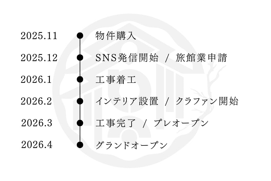 もし目標金額に届かない場合でも、自己資金や銀行融資を組み合わせ、必ずこの場所を完成させます。“心が還る宿” を一緒につくるという想いを胸に、責任を持って形にしてまいります。