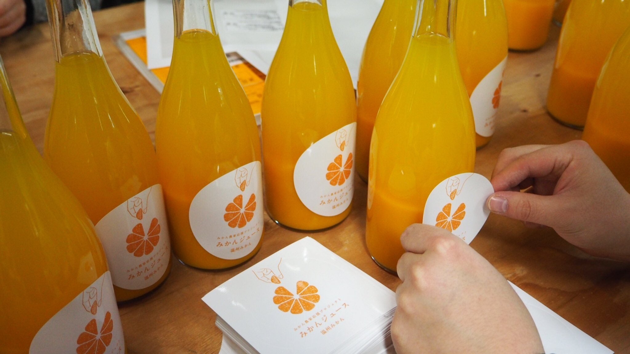約1300本のみかんジュースにラベルを貼り、キャップを付け、梱包して…