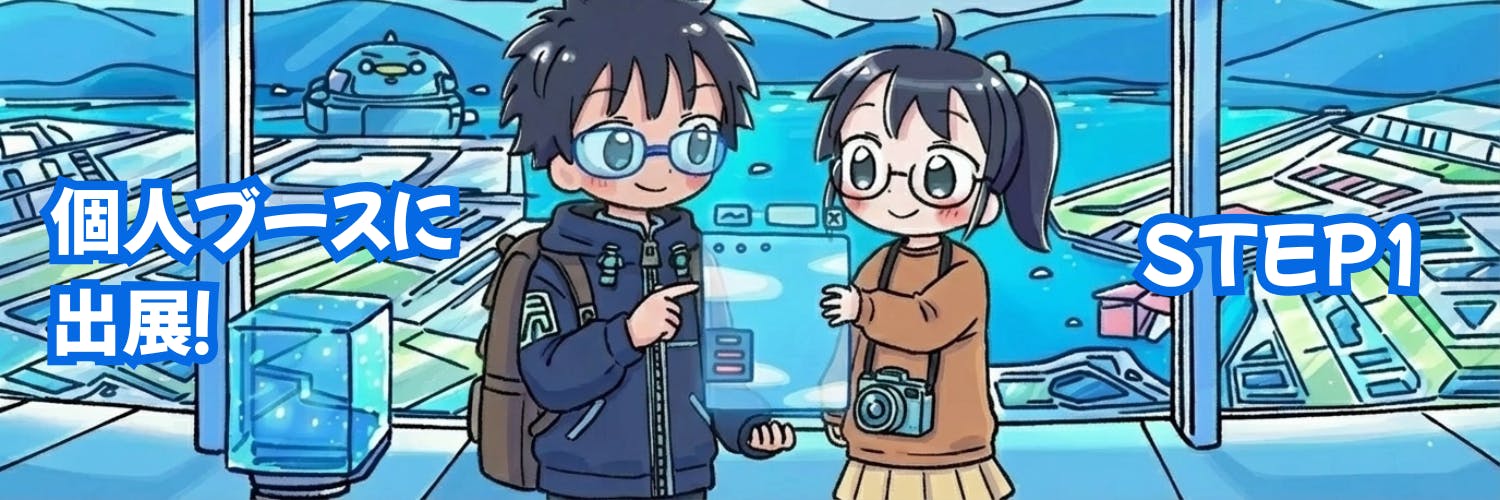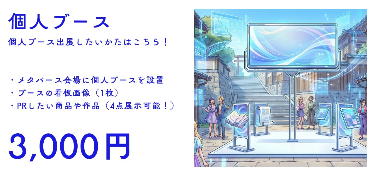 メタバース会場にあなた専用のブースが出現。看板画像と作品画像を並べて、販売ページのURLをリンクするだけ。noteの記事もBOOTHの作品も、WebのURLがあるものなら何でも出展できます。来場者がブースを訪れて、あなたの作品を見つけて、リンク先で購入する——即売会ならではの「偶然の出会い」がオンラインで生まれます。