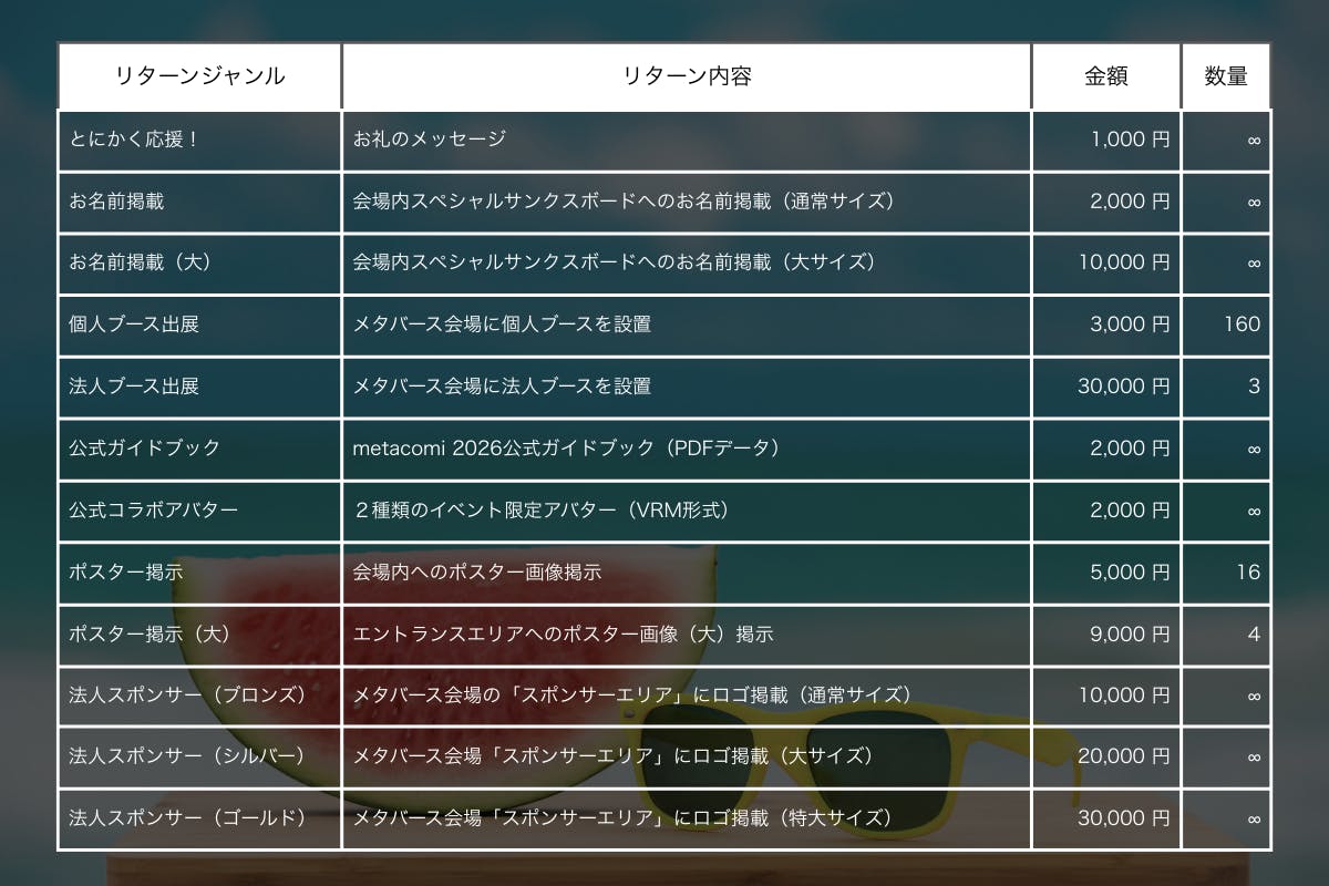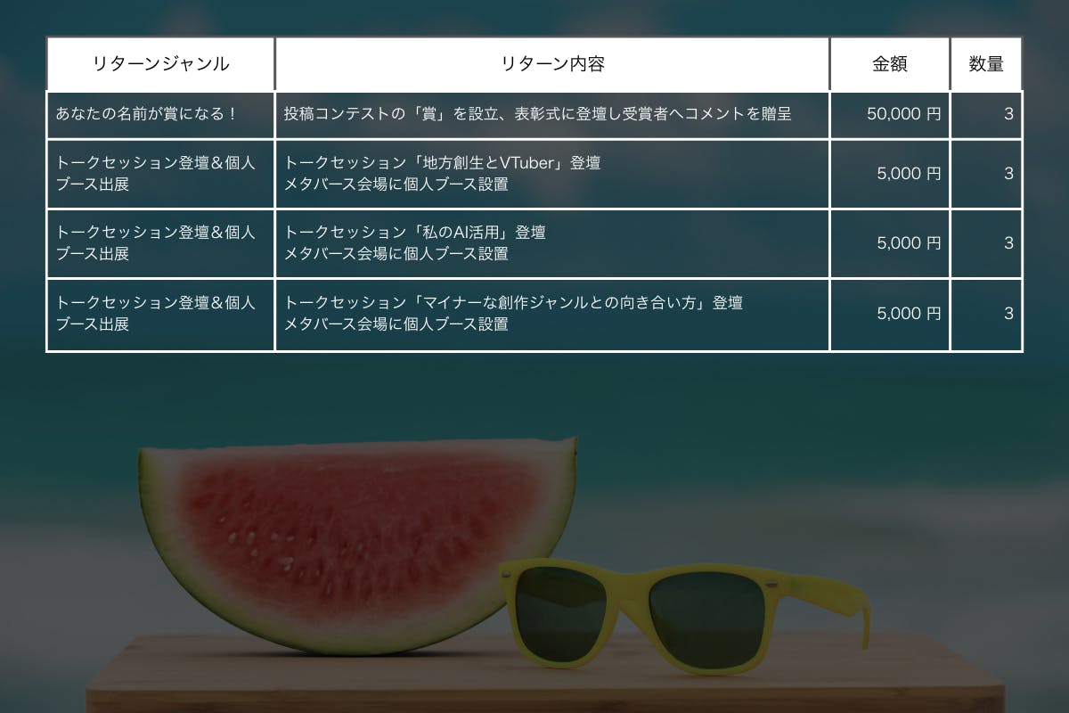 「出展して楽しむ」「応援して楽しむ」「宣伝に活用する」——さまざまな関わり方ができるリターンをご用意しました。