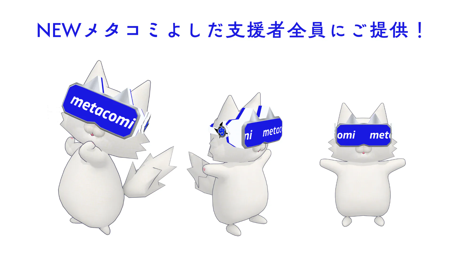 2026/03/23 12:40metacomiを応援いただき、ありがとうございます!このたび、ご支援いただいたすべての方を対象に、「NEWメタコミよしだ」アバターを追加特典としてご提供することになりました。すでにご支援いただいた方はもちろん、これからご支援いただく方も対象となります。「NEWメタコミよしだ」は、「バーチャルマンチカンよしだ」(原案:ゆうぎりさん/制作:カボチャ紳士の宵さん)をmetacomi限定デザインにしたものです。こちらは既存の「公式コラボアバター(2種類)」のリターンとは別のアバターとなります。提供方法については、後日あらためて活動報告およびメッセージにてご案内いたします。引き続き、metacomiを応援いただけましたら幸いです。よろしくお願いいたします! もっと見る