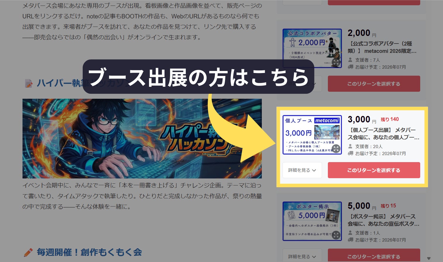 オンライン出展をご希望の方は、「リターンを選ぶ」欄の【個人ブース出展】(3,000円)をお選びください。