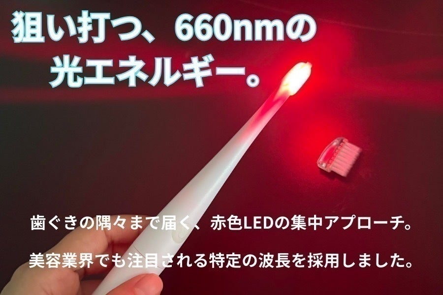 1. 660nm赤色LEDのダブル搭載 本体ヘッドに内蔵された2基のLEDが、歯肉組織を包み込むように照射。毎日のブラッシングが、まるで専門サロンでの光ケアのような体験に変わります。