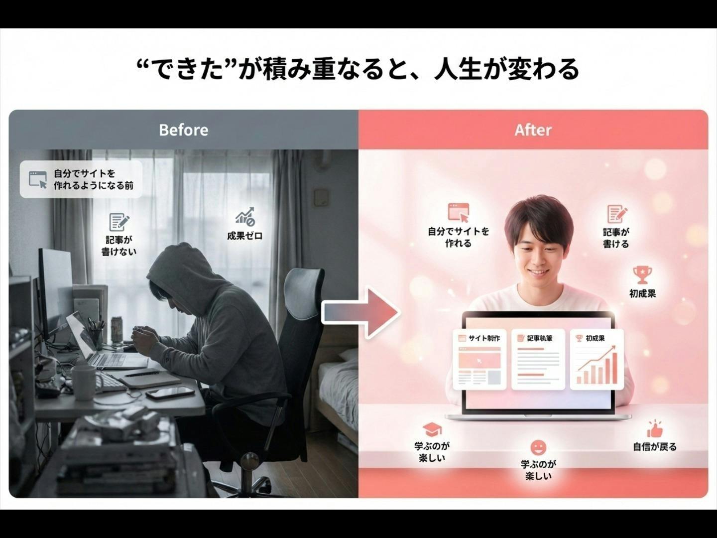しかし、アフィリエイトを始めたい多くの人が、 情報過多や複雑さのせいで最初の一歩でつまずき、 本来なら得られるはずの“できた”の喜びにたどり着けていません。