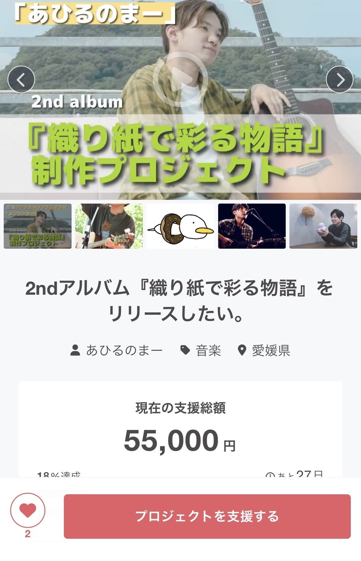 こんにちはー!まずご支援下さった皆様、本当にありがとうございます!!少しずつ成功に近づいていることを実感しています。3月に入っていよいよレコーディングが始まりました!1曲を1日掛けてレコーディングするのですが、1人で活動してるもんで忙しいんですよね笑ギターも弾くし、歌歌うしコーラスも考えーアレンジどーしよかー?とかもうね、頭フル回転。回しすぎてげっそりしてますよ?とエンジニアの方に言われてしまいました笑しかしその甲斐あって最高のテイクが録れたと思います!また随時活動報告していきますねー。クラウドファンディングを立ち上げて1週間、まだまだ皆んなに知って貰いたいので、この投稿を見た人はお近くの人にシェアして頂けると嬉しいです。引き続き頑張って参りますので、ご協力よろしくお願いします。あひるのまーより