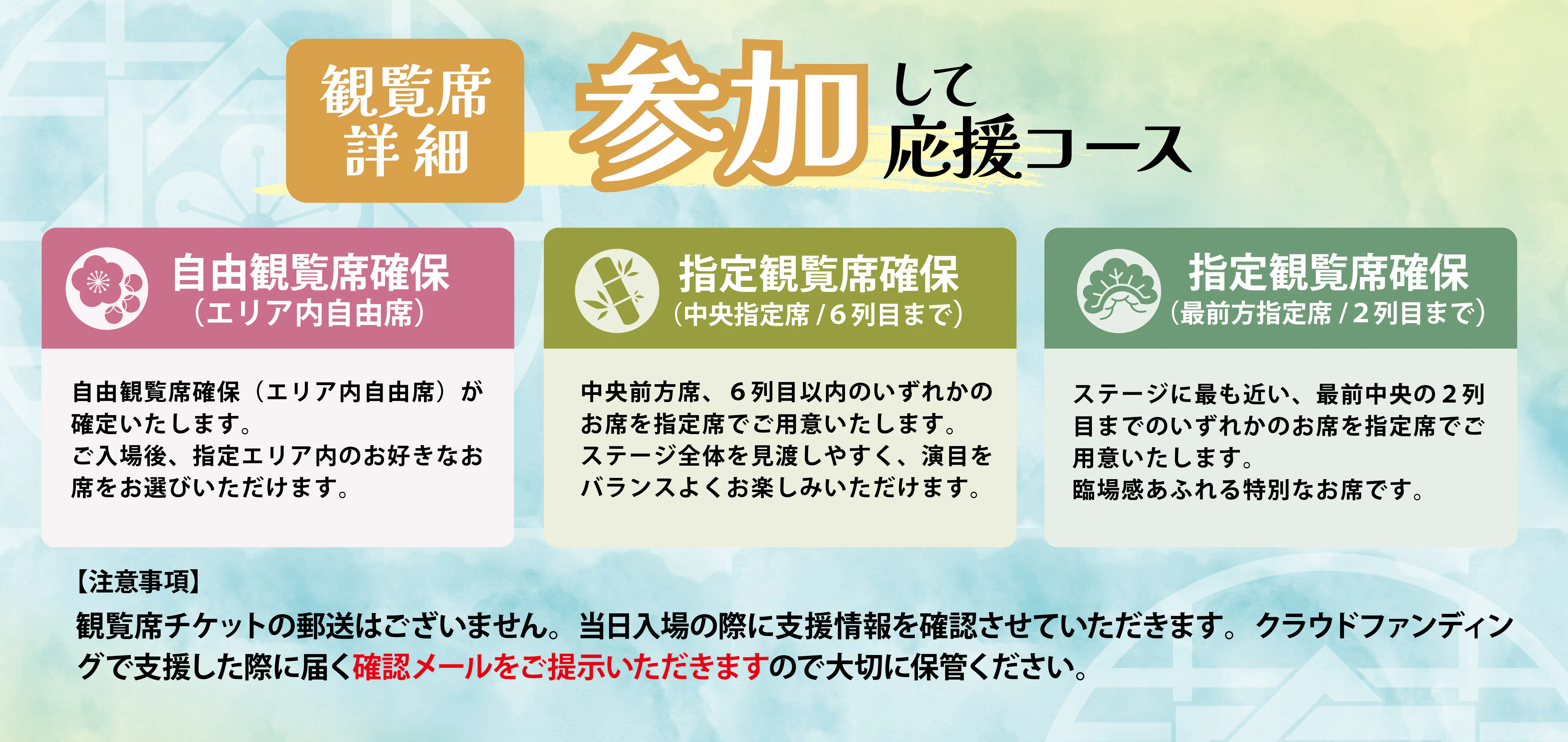 ■観覧席チケットの郵送はございません。当日入場時にクラウドファンディングで支援した際に届く確認メールをご提示いただきますので大切に保管ください。