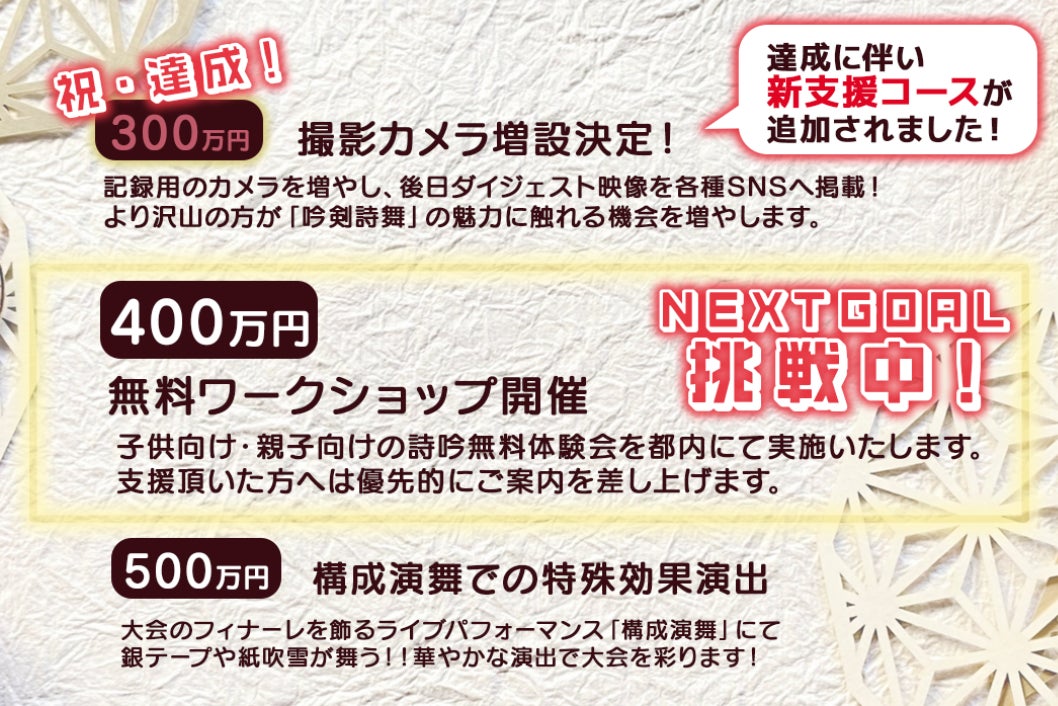次のゴール「400万円」を掲げ、よりたくさんの方がその魅力に触れる機会を増やすため、子供向け・親子向けの詩吟無料体験会を実施いたします。ご支援いただいたすべてのみなさまに優先的にご案内を差し上げます。