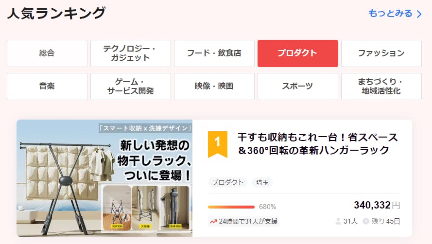 2026/03/05 12:00皆様の暖かいご支援に心より感謝申し上げます。『干すも収納もこれ一台!省スペース&360°回転の革新ハンガーラック』プロジェクトへの貴重なご支援、心からありがとうございます。CAMPFIREランキングのプロダクト部門において、1位に入賞することができました。ご支援いただいております皆様のお力添えがあってこその成果であり、心より感謝しております。今後も変わらぬご支援をお願い申し上げます。 もっと見る【お礼】目標金額達成!!