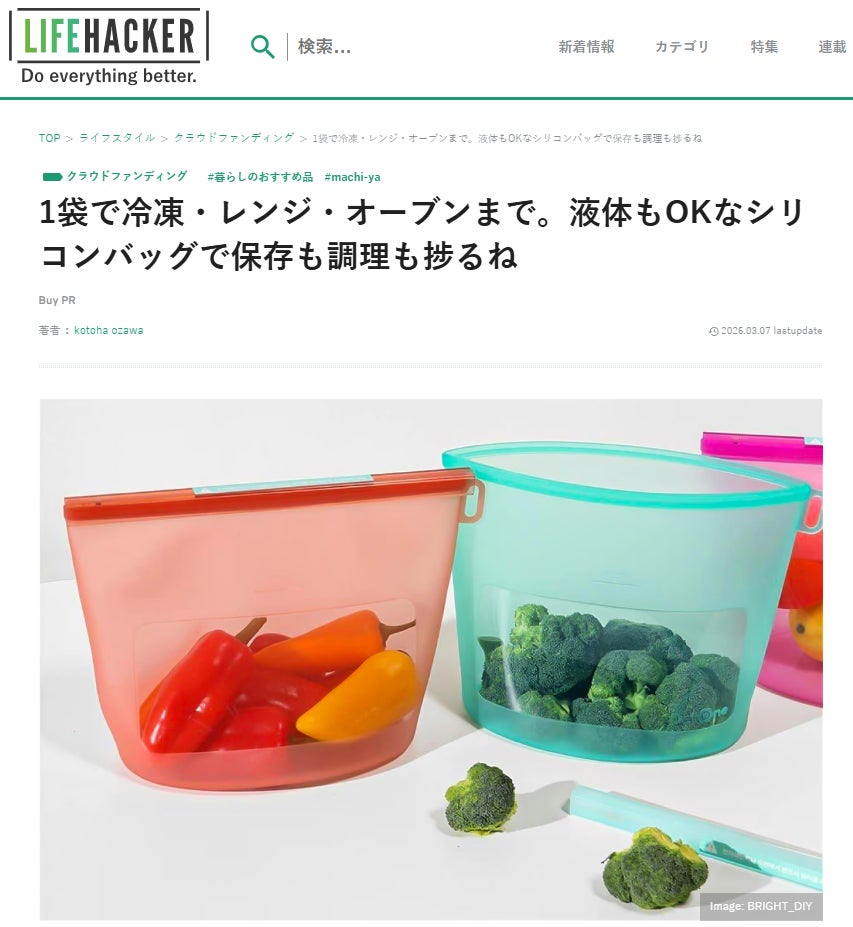 皆様、こんばんは!Bright DIYチームです。3月12日、GIZMODOで「シリコンバッグ ZF1.5」を紹介して頂きました。話題:信越化学製シリコンの保存バッグ。5000回使えて液体OK、冷凍もレンジやオーブンも対応興味がある方、是非下記のリンクからアクセスしてみてください。https://www.gizmodo.jp/2026/03/machi-ya-delione-start-928167.html【レビューの一部抜粋】〈下準備して保存した食材をそのままグリルだって可能。調理工程の多くをシームレスにこなせるので時短にもつながりますね。食洗機もOK。高熱での乾燥は除菌にもつながるので助かりますよね。他にも熱湯消毒も可能なので、離乳食や作り置きなども安心して使えそうです。マチ付きで袋自体がしっかり自立するのもポイント。食材を入れやすく袋を立てての収納もしやすくなっています。容量は約450ml(MINI)から3,000ml(XL)までの5サイズ展開。薬味や離乳食の小分けから家族分のメイン料理、作り置きまで幅広くカバー。〉ご興味のある方はこの機会をお見逃しなく!https://camp-fire.jp/projects/928167/view4月15日まで販売期間は続きますので、ぜひSNSでのシェアや身近な方にもおすすめしていただけると嬉しく思います。#siliconbag #brightdiyどうぞよろしくお願い致します。BRIGHTチーム