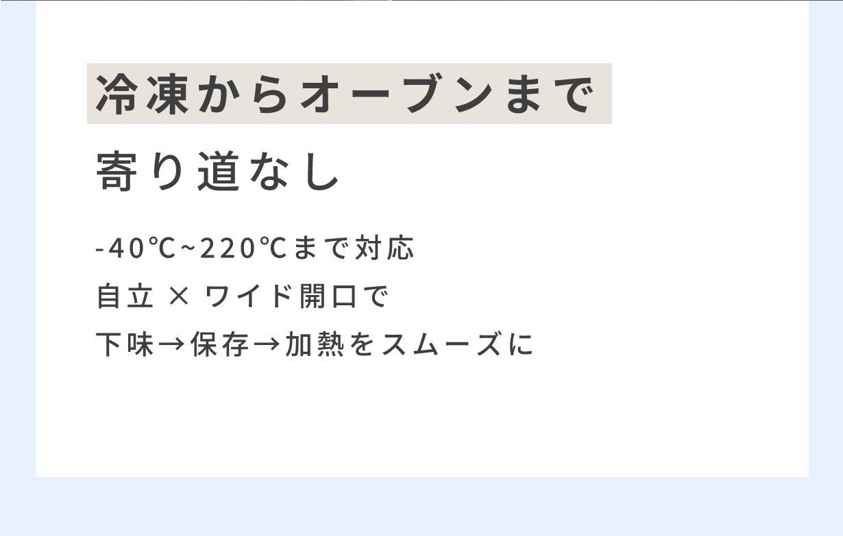 -40℃~220℃に対応するプラチナシリコン素材だからこそ、冷凍庫から出した食材をそのまま電子レンジやオーブンに入れられます。 多くの保存袋は高温に弱く、加熱時に変形したり、使えず結局容器へ移し替える必要があります。