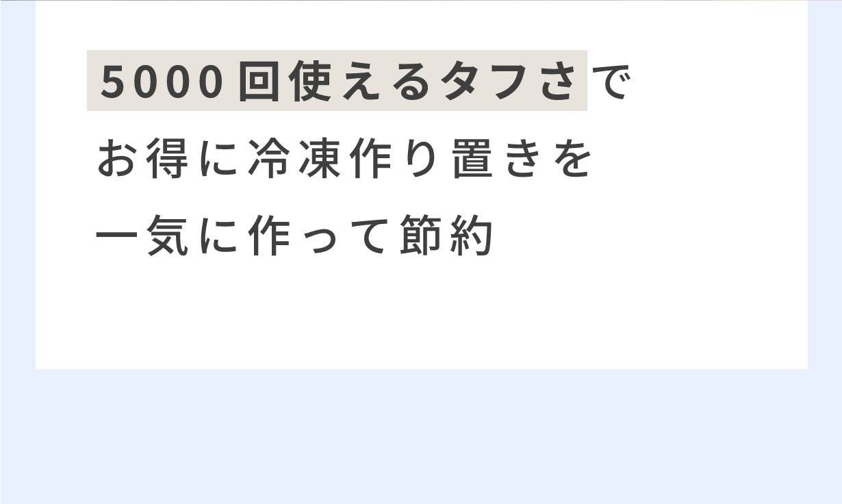 冷凍庫の低温にも耐えるため、作り置きや下味冷凍も袋のまま保存可能。食材を 小分けして立てて並べられるので、冷蔵庫や冷凍庫の整理がぐっとラクになりま す。解凍するときも移し替え不要で、そのままレンジへ。