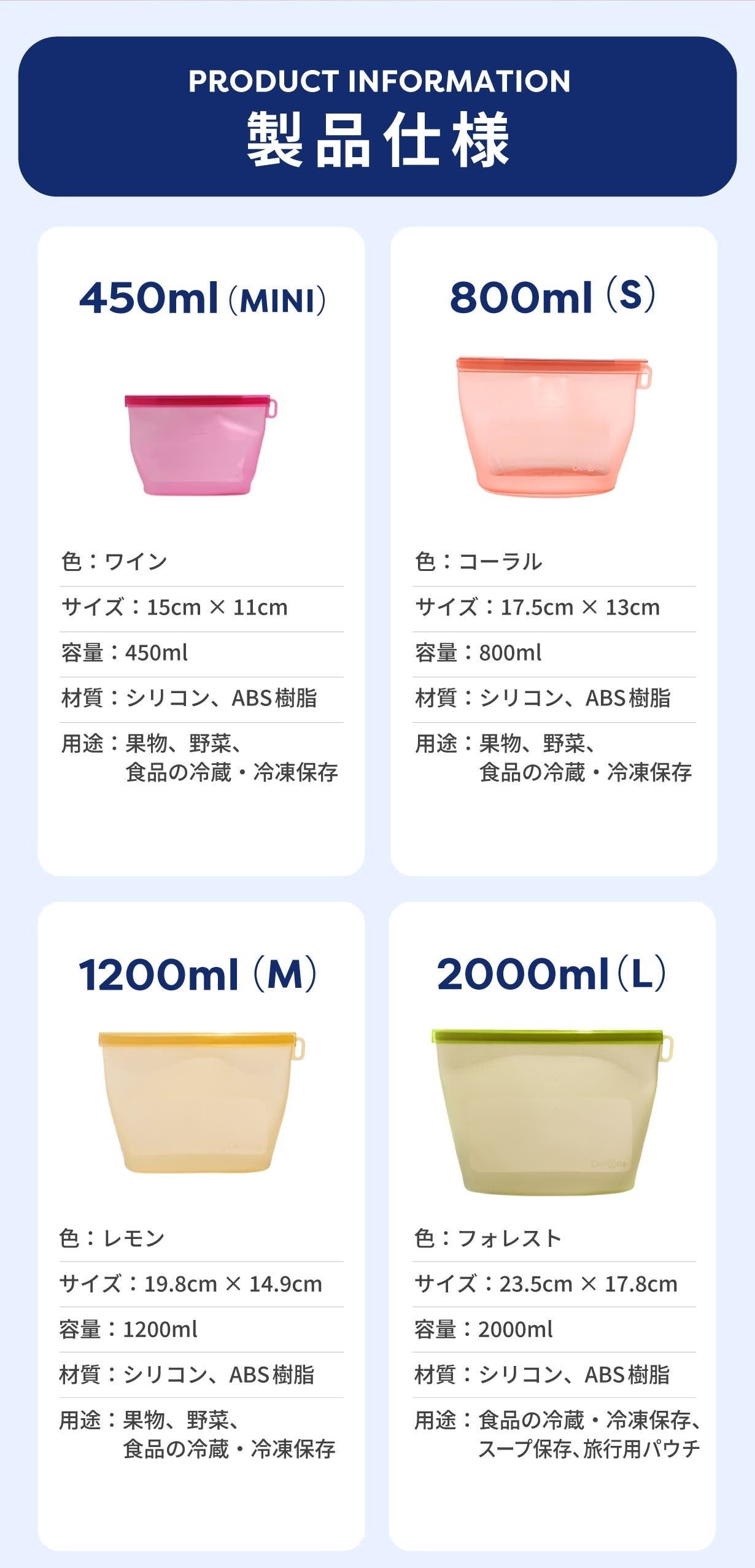 食品衛生に適したグレードであることから、日常的に繰り返し使える保存袋に最適な素材と言えます。 このプラチナシリコン素材のおかげで、DeliOne は「買い足すことなく、長く使 い続けられる」ことができ、毎日の調理や保存を支援する、キッチンに欠かせない相棒になってくれます。