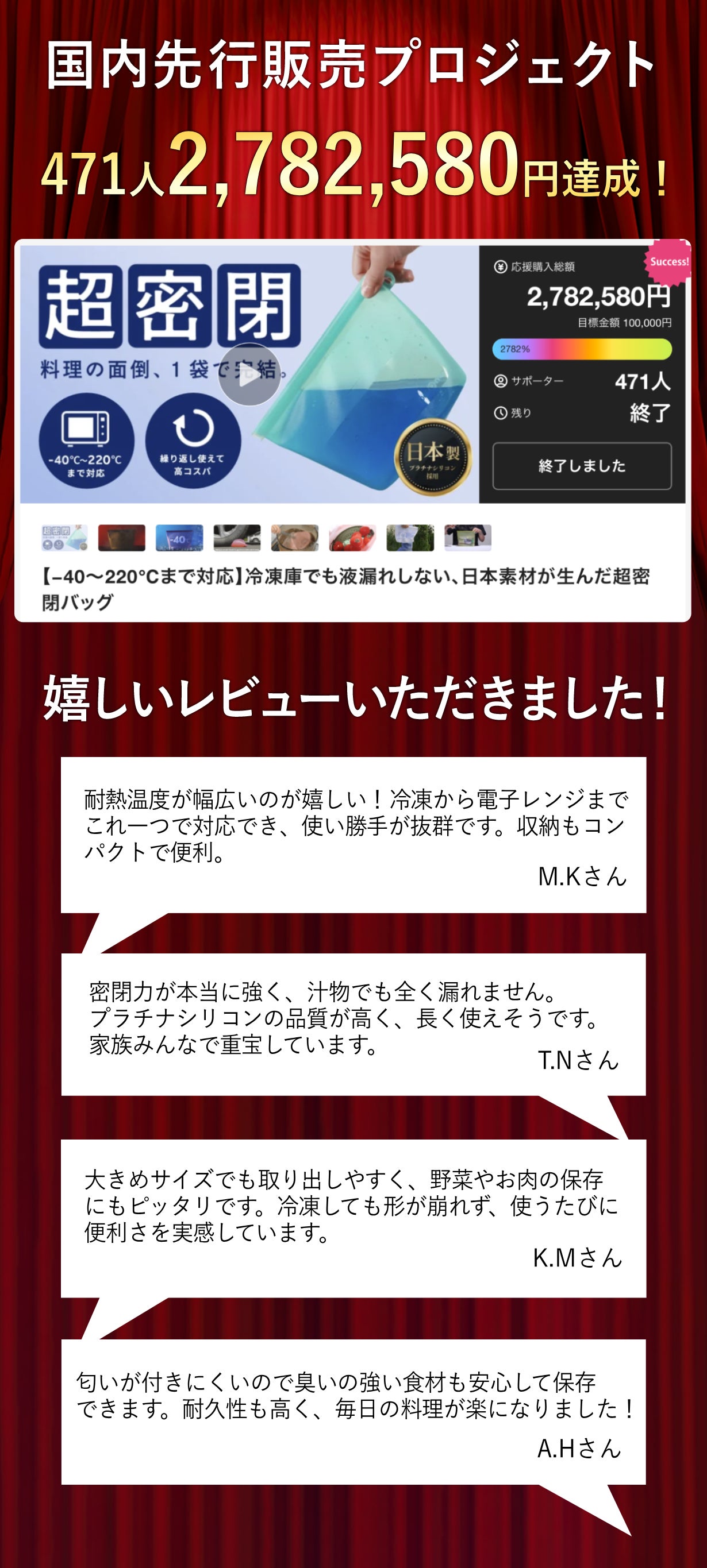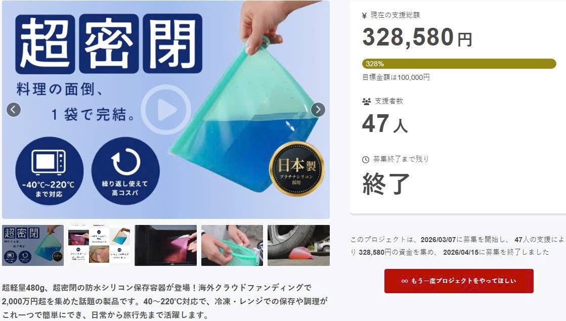 2026/04/16 13:58サポーター様、【−40〜220℃まで対応】冷凍庫でも液漏れしない、日本素材が生んだ超密閉バッグにご興味をお持ちいただきありがとうございます。プロジェクト開始から39日目で47人ものご支援者の方々より支援頂き、無事プロジェクト終了を迎えることが出来ました。早速皆様のリターンを2026年05月中にお届けできるよう準備を始めております!皆様にご満足いただけるリターンをお届けできるよう、全力で取り組んで参りますので引き続き、「【−40〜220℃まで対応】冷凍庫でも液漏れしない、日本素材が生んだ超密閉バッグ」をよろしくお願い致します。BRIGHTチーム もっと見る