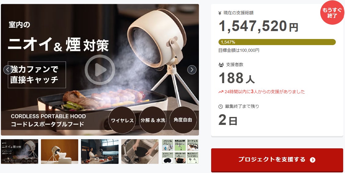 プロジェクト終了後、「煙・油・ニオイを瞬時に強力吸収する場所を選ばないコードレス換気扇」をMachi-Ya特別価格で入手することはできなくなりますので、ご支援がまだの方、追加支援 をご検討の方はお急ぎくださいますようお願い申し上げます。