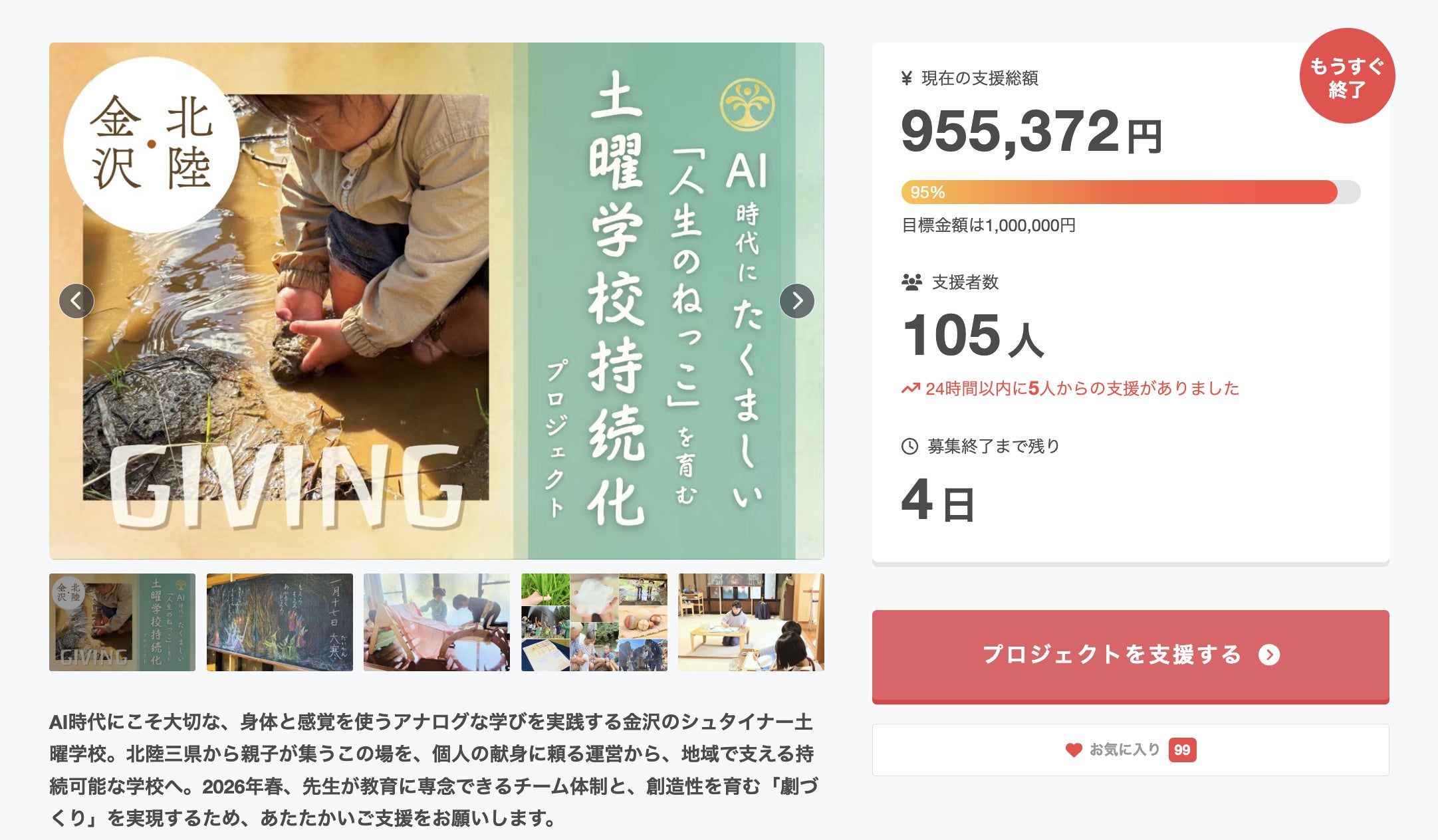 2026/04/16 16:35皆様、こんにちは!白山ウォルドルフコミュニティ(金のいずみ土曜学校)の矢後です。目標の100万円まで、ついに残り4.5%(約4.5万円)となりました!現在の支援総額は955,372円、支援者数は105名様。ゴールテープが目前に見えてまいりました。■地元から、そして各地から届く「共鳴」の輪ここ数日の勢いに乗り、直近の24時間でも新たに5名の方がご支援者となってくださいました。地元・北陸はもちろん、京都、和歌山、広島、東京、さらには海を越えたカナダ・バンクーバーからも熱いメッセージが届いています。「子どもたちの大切な場所を共に」皆様からの一言ひとことに、メンバーみんなで目頭を熱くさせ、勇気をいただき、これほど多くの方々と想いを一つにできていることに、深い喜びを感じています。■運命の「100人目」はどなたに!?今、プロジェクトページで注目していただきたい数字があります。それは「お気に入り」の登録数。現在「99名」です!あとお一人で、100人目の大台に到達します。「支援はまだ迷っているけれど、活動には共感している」という方へ。ぜひ、ページ内の「お気に入り(ハート)」ボタンをポチッと押して、記念すべき100人目の扉を開けていただきたいと願っています。そのひと押しが、ゴールを目前にした私たちにとって、大きな追い風になります。■子どもたちが世界を信頼できる未来のために募集終了まで、いよいよ残り4日となりました。皆様と共に歩んできたこの一歩一歩は、わたしたちを通して子どもたちに届き、「世界はあたたかく、信頼できる場所だ」と感じられる糧となっています。本当にありがとうございます。最後のゴールへ向けて、個人様、企業様、何卒よろしくお願いいたします。SNSでのシェアや拡散も、私たちの大きな力になります。最高の瞬間を、皆さんと一緒に迎えたいです!最後まで全力で走り抜けます。残り4日、100%達成の瞬間を一緒につくっていただけますよう、何卒よろしくお願い申し上げます。 もっと見る