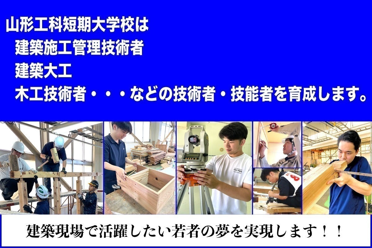 改めまして、われわれ山形工科短期大学校(以下、短大校/山形県長井市)は、建築専門の職業能力開発短期大学校(厚労省所管、山形県認可)で、建築施工管理技術者・建築大工・木工技術者など、主として建築現場で活躍する若年技術者・技能者を目指す方を対象に、2年間の短期間で教育訓練を行っております。