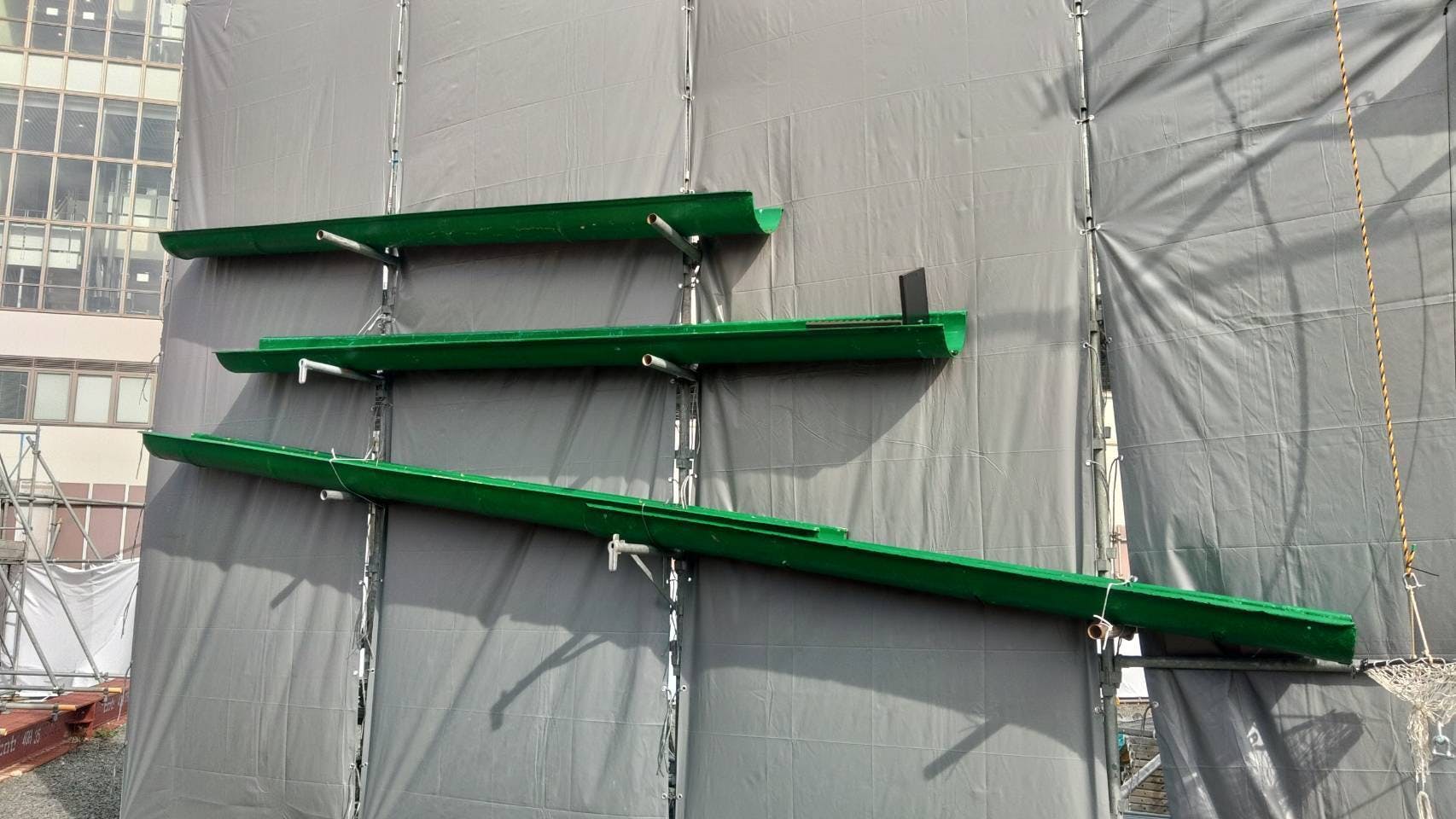 足場材にシートを張ったり、シューターの角度を調整したり・・・