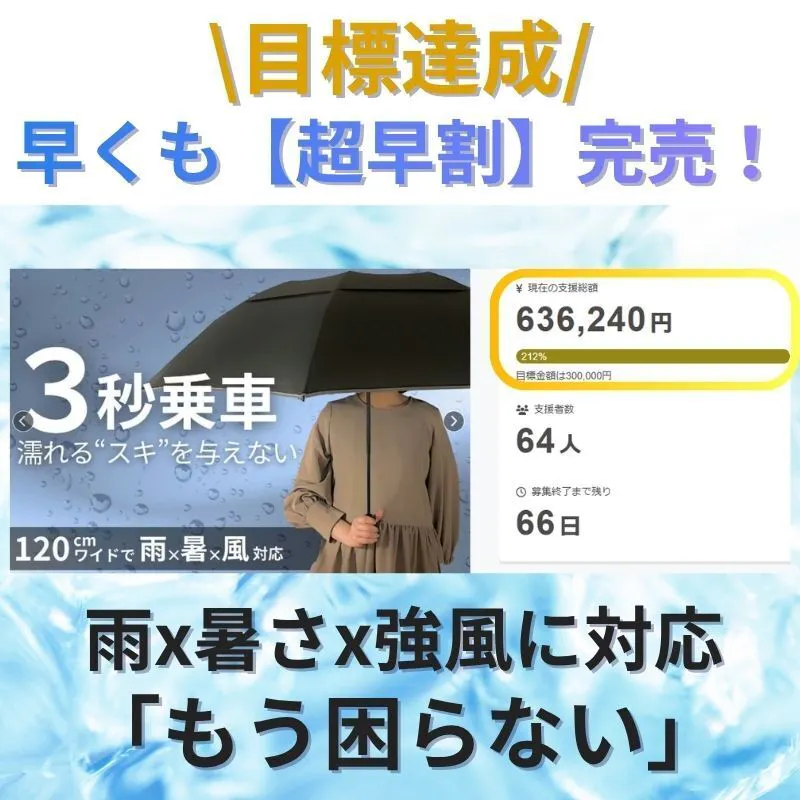 2026/03/24 17:00支援者のみなさまいつもプロジェクトの応援ありがとうございます。公開5日目、雨×暑×風対応の120㎝ワイドな傘が、目標を達成、超早割が完売となるなど公開早々からたくさんの方々にご支援いただいております!本当にありがとうございます。さくらも咲き始め、心地の良い気温となりましたが、来週の天気はすこし下り坂のようですね...皆さんお持ちの傘に不具合や不足はありませんか!?普段は気にしない傘ですが、いざ雨が降ったり、使おうと思って開くと壊れていたり、家族の人数分が無かったり。さらに、家に傘はあるのにちょっと外出したら雨に見舞われ車から出れず…わたしもそのような場面にちょこちょこ出くわしてしまいますが、やはり雨や外出時の備えは事前に行うのが一番ですね!もし「前回無くしたままだった」「1本壊れてたんだった」。そんな方がいらっしゃいましたら、この『全天候対応のワイドな傘』も一度ご覧ください!きっと「もう困らない」、そんな1本になると思います!!▶【販売会場はこちら】 もっと見る