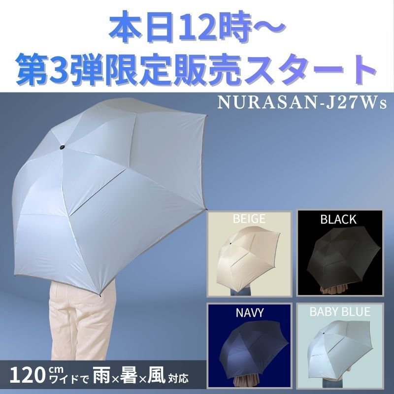 支援者のみなさまいつもプロジェクトの応援ありがとうございます。本日12時より雨×暑×風対応の120㎝ワイドな傘【NURASAN-J27Ws】の第3弾限定販売がはじまりました!累計1,280万円、のべ1,300名を超える方々にご支援いただいたシリーズ最強の晴雨兼用傘!本日も雨が降っておりますが、年々暑くなる夏、急に降り始めるゲリラ豪雨に突風。あなたも悩まされていませんか!?そんな場面も“この1本”で解決。職場や車に予備として、バッグに忍ばせていざというときに、メインの傘としてももちろんお使いいただける1本。NURASANシリーズをご愛用している方の声もご紹介しますのでぜひチェックしてください!4色展開でお待ちしております。▶【販売会場はこちら】>>レビューコメントはこちら
