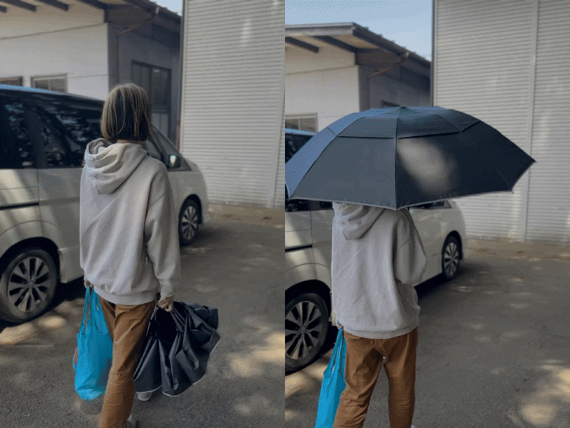 そんな猛暑日には、傘をワンタッチで開いて自分だけの避暑地に。