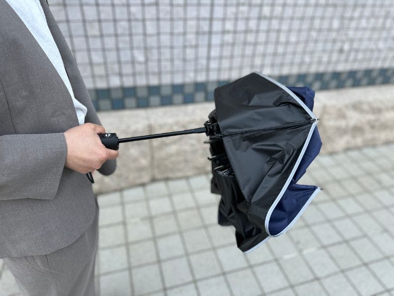 そんなことにならないように、通常の傘とは逆に、雨粒が内側へ折りたたむ構造に。