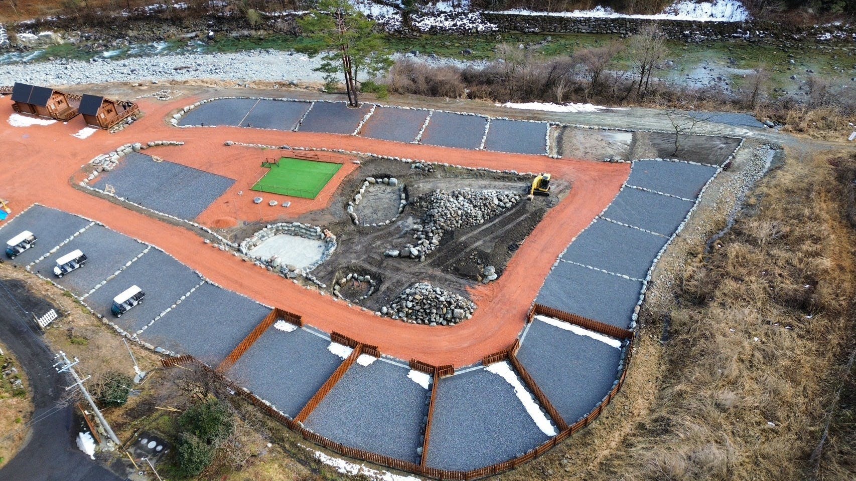 池は大小合わせて5つ作る予定です。メインとなる滝が流れる大きな池を始まりとして、釣り用池、魚つかみ体験池というような内容です。5月中の完成を目指して日々工事を進めているところです!