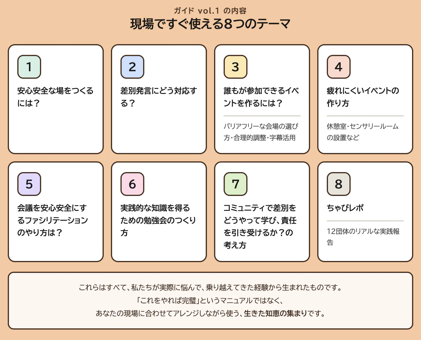 ☑️12団体のリアルな経験(ちゃびレポ)を詰め込んだ、現場で使える“生きたガイド”をより多くの人へ届けるために、あなたの支援で、誰も置き去りにしない新しいアクションの波を一緒に広げてください。