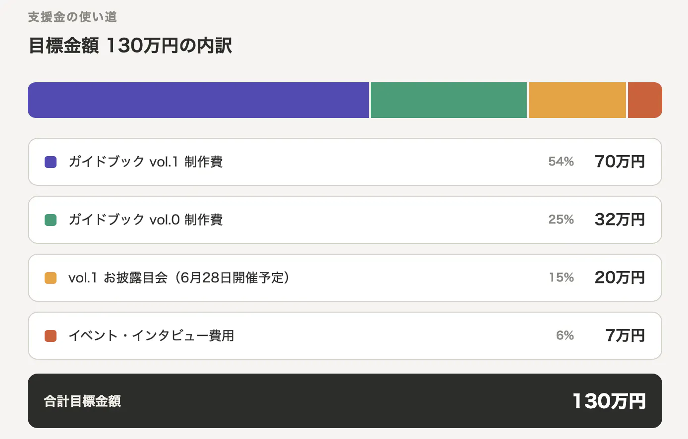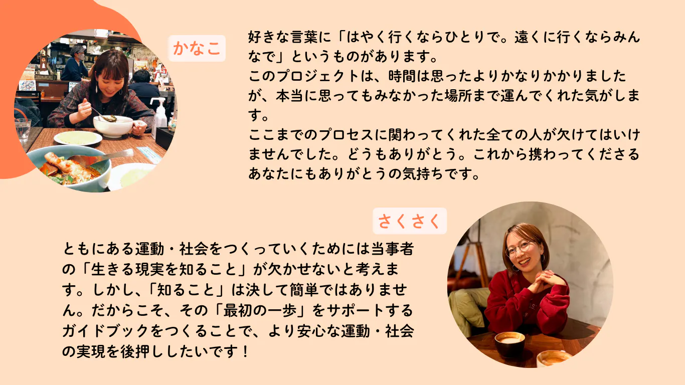 2026/03/23 20:37(やさしいにほんご は した にあります)みなさまこのたびは、立ち上げたばかりの私たちのクラウドファンディングにご寄付をいただき、本当にありがとうございます。なんとプロジェクト開始から6日間で15%を達成することができました! メンバー一同とてもうれしく思っています。私たちは「異なる立場の人たちが尊重され、置き去りにされない社会」をつくることを目的とし、ガイド制作チーム「波乗りちゃびー」を立ち上げました。ガイドを作る過程で活動の枠を超えて繋がり、お互いが学び合う土壌を形成することでこれを達成したいと考えています。そこで、是非みなさまともつながり、学び合う場を作り続けたいと考えています。そのため、これからも多くのご支援をいただけますよう、みなさまからも、周りの方などに、「いい取り組みだよ、こんなプロジェクト応援しているんだよ」とご紹介していただきたいです!といってもこのプロジェクトを説明するのが難しいなと感じた方は、是非ちゃぶじょのSNS(Instagram、Facebook)をチェックしてください。クラファンの内容をまとめたものを随時更新していきます。Instagram: https://www.instagram.com/chabujo/Facebook: https://www.facebook.com/chabujo/?locale=ja_JPまた、ご支援いただいたことをSNSなどで拡散していただけると大変心強く、励みになります。是非この勢いで、目標達成できるように引き続き応援をよろしくお願いいたします!![ちゃびフレメンバー紹介&このプロジェクトへの想い]今後、活動報告にて、お互いが学び合う場のファーストトライとして参加してくださっている方々(ちゃびフレメンバー)の紹介とこのプロジェクトへの想いをご紹介していきます。ちゃびフレメンバーの方々は、ご自身の活動されている団体や組織などをより安心安全な場にしたいという気持ちから、ちゃびフレ会に参加してくださっています。ちゃびフレ会では、ちゃびフレメンバーの各活動で挑戦したアクション、その工夫を共有しています。今回はお三方を紹介させていただきます。〈けんせい〉時間やパワー、資源が限られている中で、誰もが安心安全に参加できる場を作っていくことは容易ではないです。だからこそ、このプロジェクトに関わることや、ガイドブックが社会に広がっていくことが、(誰かが)安心安全の社会運動を作る一助になればと思います。〈はるき〉生活を通して抱えた違和感を話し合う友人間の場から一歩踏み出し、「感じたもの・ことをどうしていけるか」を安全に一緒に考えていける活動があることが心から嬉しいです。何かについて考えるとき、自分や誰かを救おうとする手で別の誰かを振り払っていないか。自分の視界の外にある痛みに気づけぬまま動き出すことへの恐怖や戸惑いで進めなくなってしまうこともありえます。あらゆる状況においてこのガイドは希望になっていくと思います。その過程に立ち会えることが光栄です。〈さいとう・まの〉みんなが それぞれ もっている けんりを ふみにじらない、 そんな せきにんを はたし、 はたさせ、 はためかす。 びょうどうな へいわの じつげんを めざします。お三方のご紹介だけでも、ちゃびフレ会には多様な方面で活動をされている方々が参加されていることが分かりますね!!だからこそ私たち運営メンバー(波乗りちゃびーメンバー)だけでは出てこないアイデアや活動内の工夫を沢山共有してくださっています。引き続き、ちゃびフレメンバーのご紹介もしていきますので、ぜひチェックしてください!ーーーー〈やさしいにほんご〉みなさま、こんにちは。わたしたちのクラウドファンディングをおうえんしていただき、本当に ありがとうございます。 6日間(むいかかん)で、 15%まで 集(あつ)まりました! メンバー全員(ぜんいん)、とても うれしく 思(おも)っています。私(わたし)たちは「異(こと)なる立場(たちば)の人(ひと)たちが尊重(そんちょう)され、置(お)き去(ざ)りにされない社会(しゃかい)」をつくることを目的(もくてき)とし、ガイド制作(せいさく)チーム「波乗(なみの)りちゃびー」を立(た)ち上(あ)げました。ガイドを作(つく)る過程(かてい)で活動(かつどう)の枠(わく)を超(こ)えて繋(つな)がり、お互(たが)いが学(まな)び合(あ)う土壌(どじょう)を形成(けいせい)することでこれを達成(たっせい)したいと考(かんが)えています。これからも、たくさんの人(ひと)に おうえんしてほしいです。 ぜひ、周(まわ)りの人(ひと)に「いい活動(かつどう)だよ」「応援(おうえん)しているよ」と 伝(つた)えてください!「説明(せつめい)するのが 難(むずか)しいな」と 思(おも)ったときは、私(わたし)たちの SNSを 見(み)せてあげてください。また、SNSで このプロジェクトを 広(ひろ)めてくれると、とても 心強(こころづよ)いです。 目標(もくひょう)を 達成(たっせい)できるように、これからも 応援(おうえん)を よろしく お願(ねが)いします。[ちゃびフレメンバーの紹介(しょうかい)]「ちゃびフレメンバー」