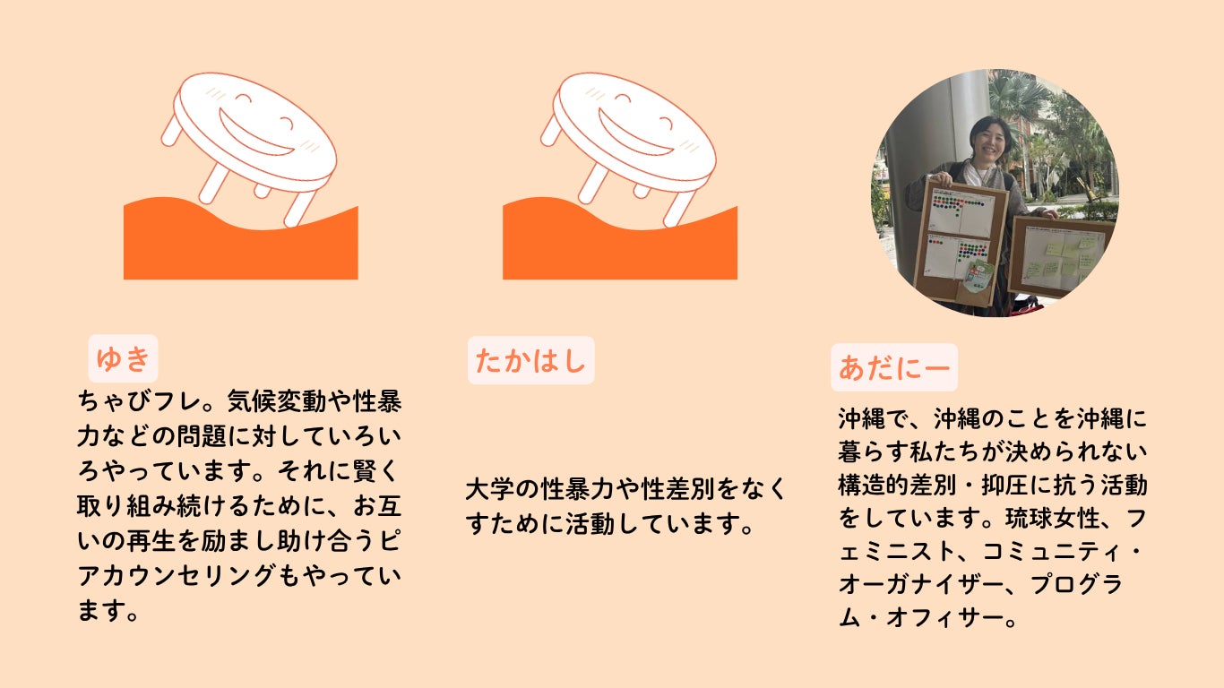 主(おも)に大学(だいがく)の性差別(せいさべつ)・性暴力(せいぼうりょく)という観点(かんてん)から、差別(さべつ)や抑圧(よくあつ)のない誰(だれ)もが安心(あんしん)していられる社会(しゃかい)を実現(じつげん)したいと思(おも)って活動(かつどう)してきました。ちゃびフレ会(かい)を通(とお)して、同(おな)じ思(おも)を持(も)ちつつ多様(たよう)な立場(たちば)・視点(してん)から社会(しゃかい)をよくするために活動(かつどう)している方(かた)々と出会(であ)えたことは宝物(たからもの)です。