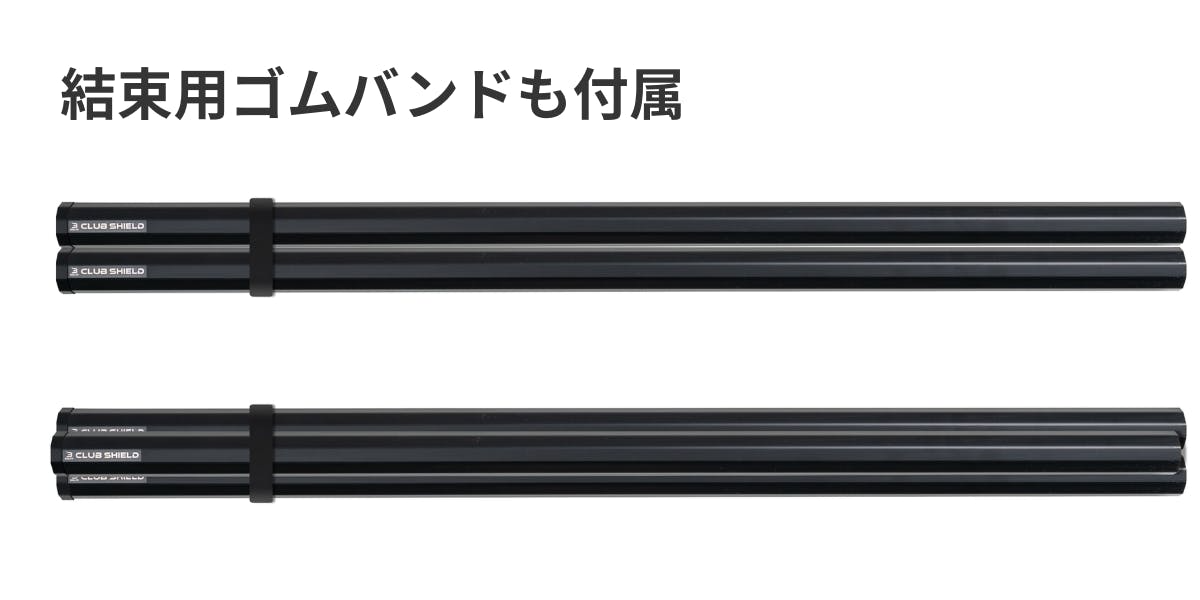 さらに、ゴルフバッグはメーカーによってサイズが異なるため、もしシールド同士がわずかに動いてしまう場合に備えて、軽くまとめられる結束用ゴムバンドも付属。必要なときだけ、安定性をプラスできます。