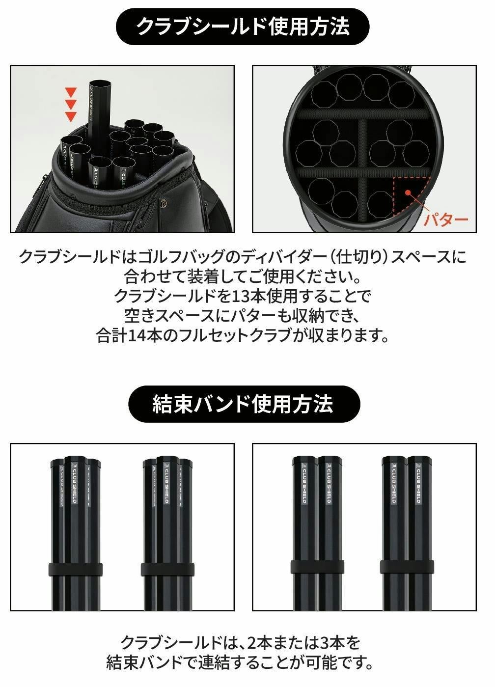 「Club Shield(クラブシールド)」は、クラブを1本ずつ独立収納できるうえ、約85cmのロング設計でグリップからシャフト先端までを個別に保護します。そのため、バッグの中でクラブ同士がこすれたりぶつかったりせず、摩擦や傷つきをしっかり防げます。