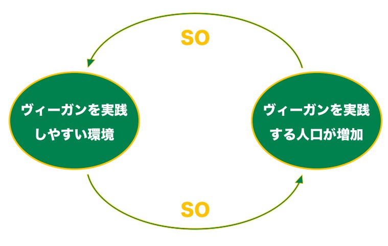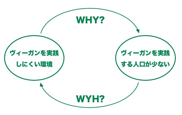 そこでこの循環を解決するためには、ヴィーガンを実践する人を増やすか、ヴィーガンを実践しやすい環境を整えるか、どちらかに取り組む必要があります。
