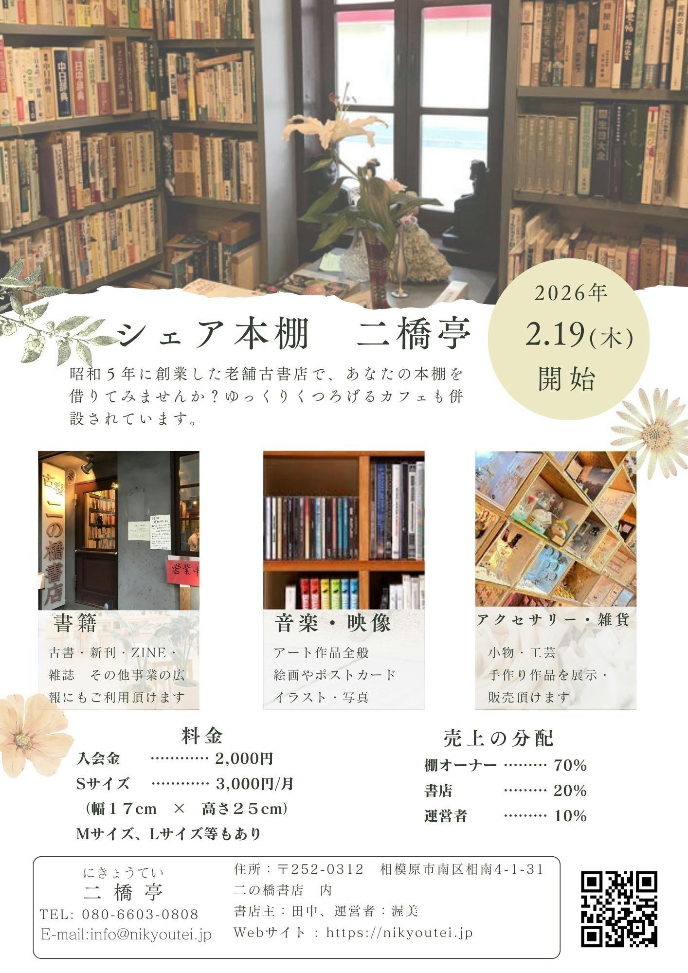 昭和5年創業から続く古書店の文化を次の世代へ。私たちは【シェア本棚ニ橋亭】を通じて、本や表現活動の場を地域に創出するプロジェクトを始めました。書籍はもちろん、ZINEや雑誌、音楽、映像、絵画、手作り作品まで。様々なクリエイターや表現者が、自分たちの作品を発表できるプラットフォームを目指しています。