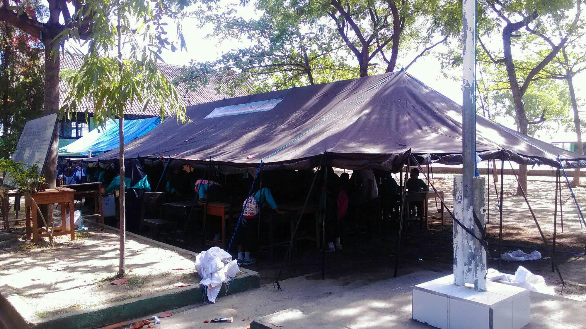 上の写真は、遅れて配布した北ロンボクのバヤン地区ロロアン村の小学校での、テント使用状況です。11月に入り雨季が始まったため、テントの中で勉強できることは子供たちにとって大きな安心となっている様子です。