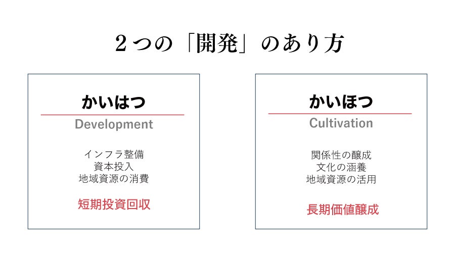 仏教の言葉に「かいほつ(開発)」という概念があります。もともとは“仏の可能性を開く”という意味ですが、私たちはこの考え方を「カルチベーション(Cultivation)」と訳し、地域に置き換えて捉え直しています。