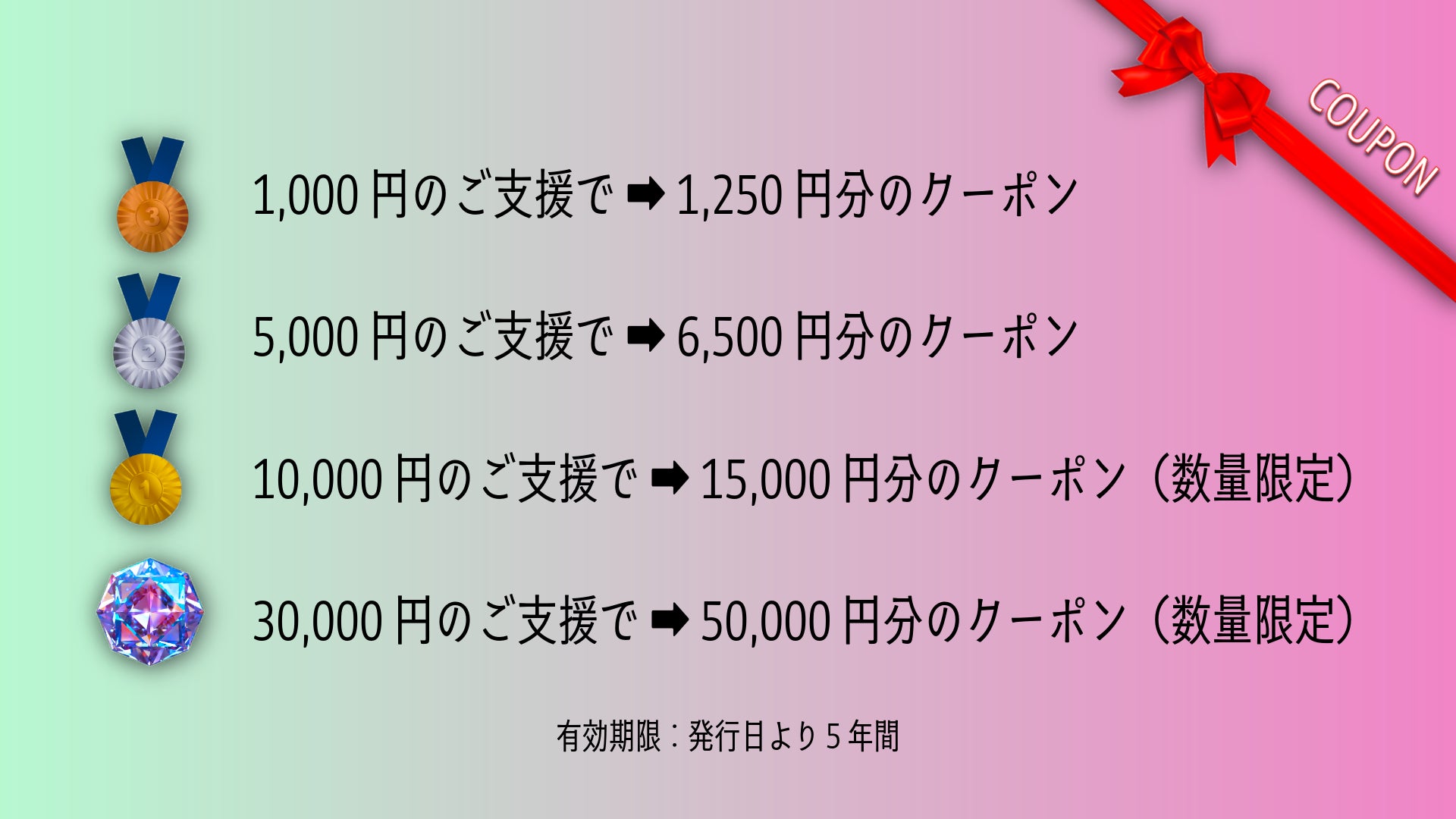 ご支援の返礼は、サイト公開後にいつでも使っていただけるクーポンを用意いたしました。