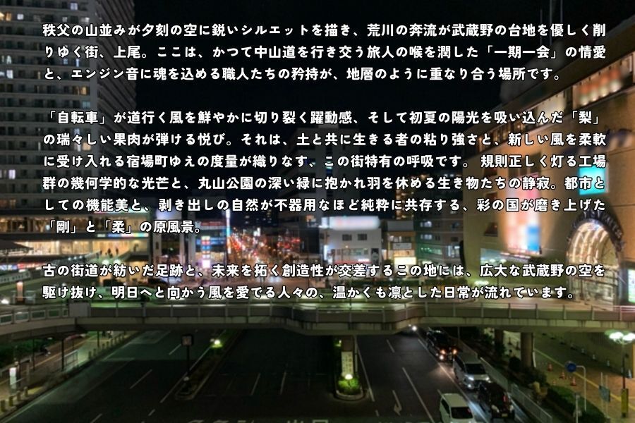 しかし、上尾の真の魅力はまだ十分に伝わりきっていません。近隣のさいたま市や川越市が「鉄道の街」や「小江戸」という強固なブランドを持つのに対し、上尾は「都心のベッドタウン」や「国道沿いの郊外都市」という一側面的なイメージに留まりがちです。その背景にある、江戸時代から旅人の心身を癒やしてきた宿場町のホスピタリティ、世界を牽引する輸送機器産業を支える技術者たちの矜持、そして「自転車のまち」として健やかな暮らしを謳歌する市民の日常といった「上尾の真髄」に触れる機会は、まだ少ないのが現状です。
