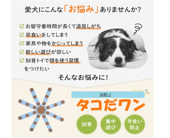 犬の知育おもちゃ、ストレス解消、早食い防止、飼い主さんのちょっとした時間確保に役立つおもちゃ、タコだワンを多くの飼い主さんに届けたいと考えています、安全で丈夫、丸洗いも出来ます、家の中でも、外でもキャンプ場でもワンちゃんが毎日楽しく遊べる環境を作ることが目標です。