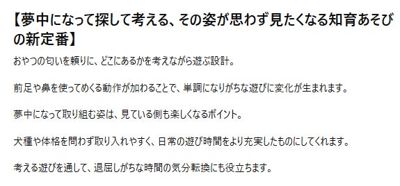 噛むだけのおもちゃではなく、嗅いで・探して・考える犬本来の力を引き出す遊びを、もっと身近なものにしたい。
