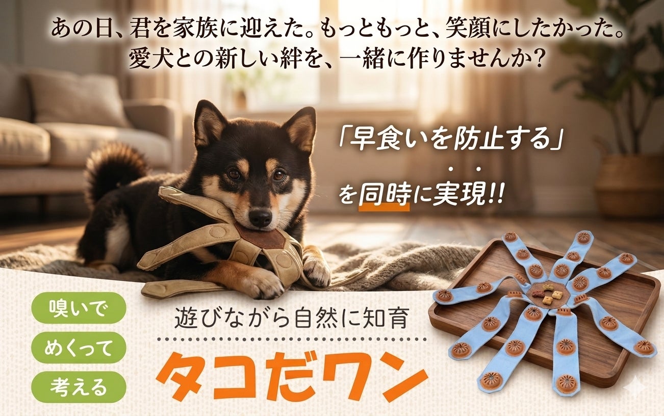 犬の知育おもちゃ、ストレス解消、早食い防止、飼い主さんのちょっとした時間確保に役立つおもちゃ、タコだワンを多くの飼い主さんに届けたいと考えています、安全で丈夫、丸洗いも出来ます、家の中でも、外でもキャンプ場でもワンちゃんが毎日楽しく遊べる環境を作ることが目標です。