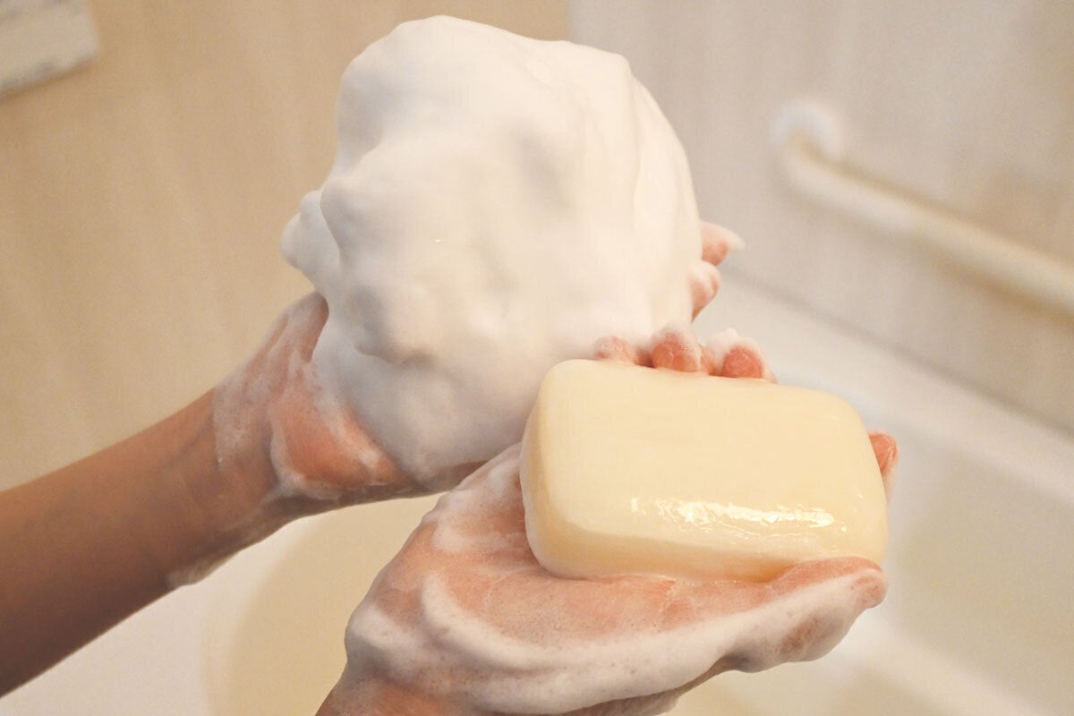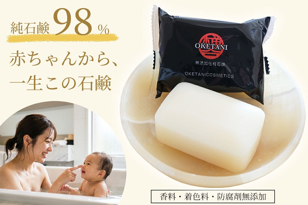 職人の引退により市場から消えた石鹸の使用感を、4年の研究開発を経て再現しました。純石鹸成分98%。着色料・香料・防腐剤・合成界面活性剤などの添加物を使用しない無添加石鹸です。敏感肌の方はもちろん、小さなお子様からご高齢の方まで、頭の先から足の先まで全身にお使いいただける低刺激の固形石鹸です。