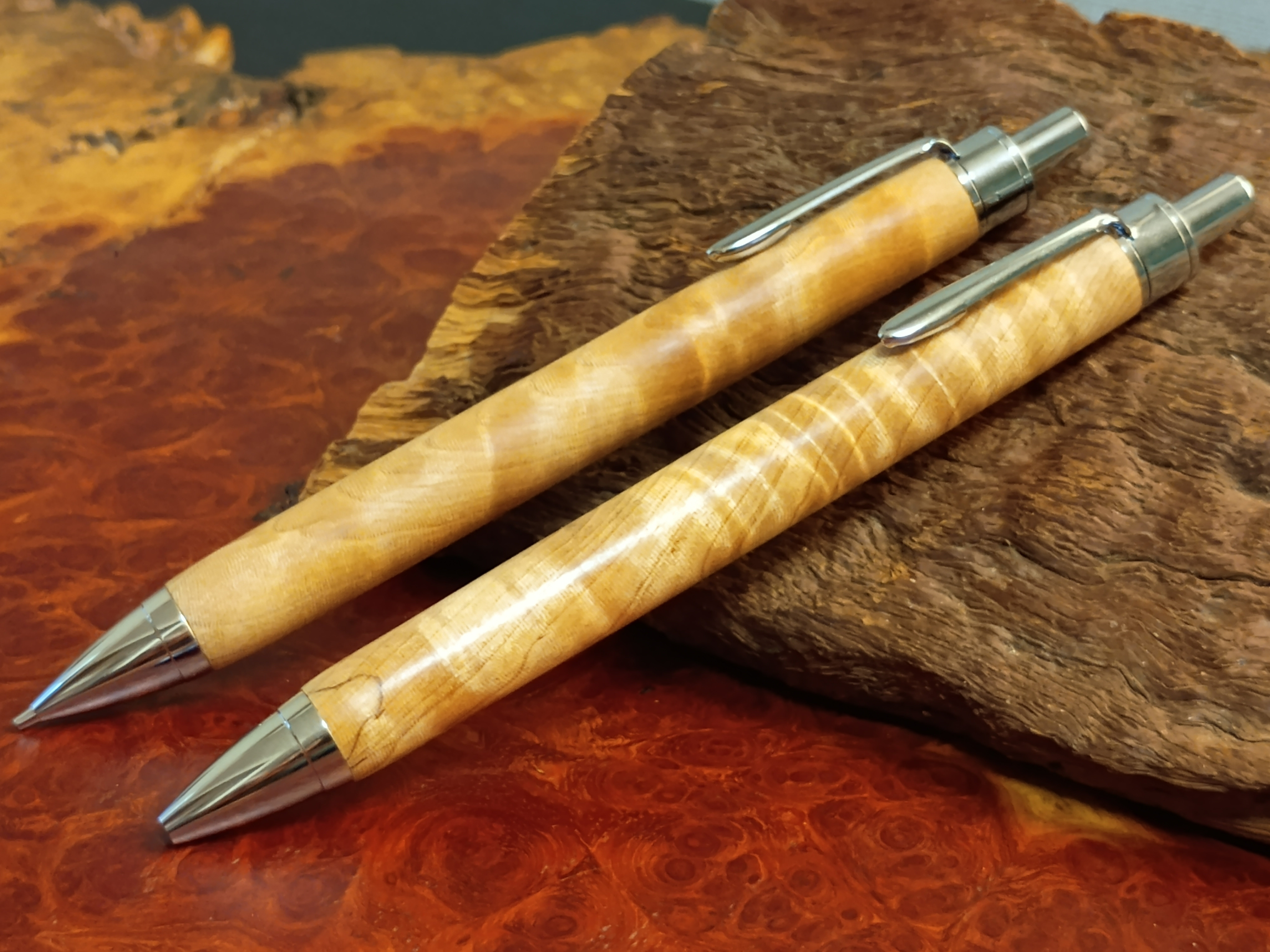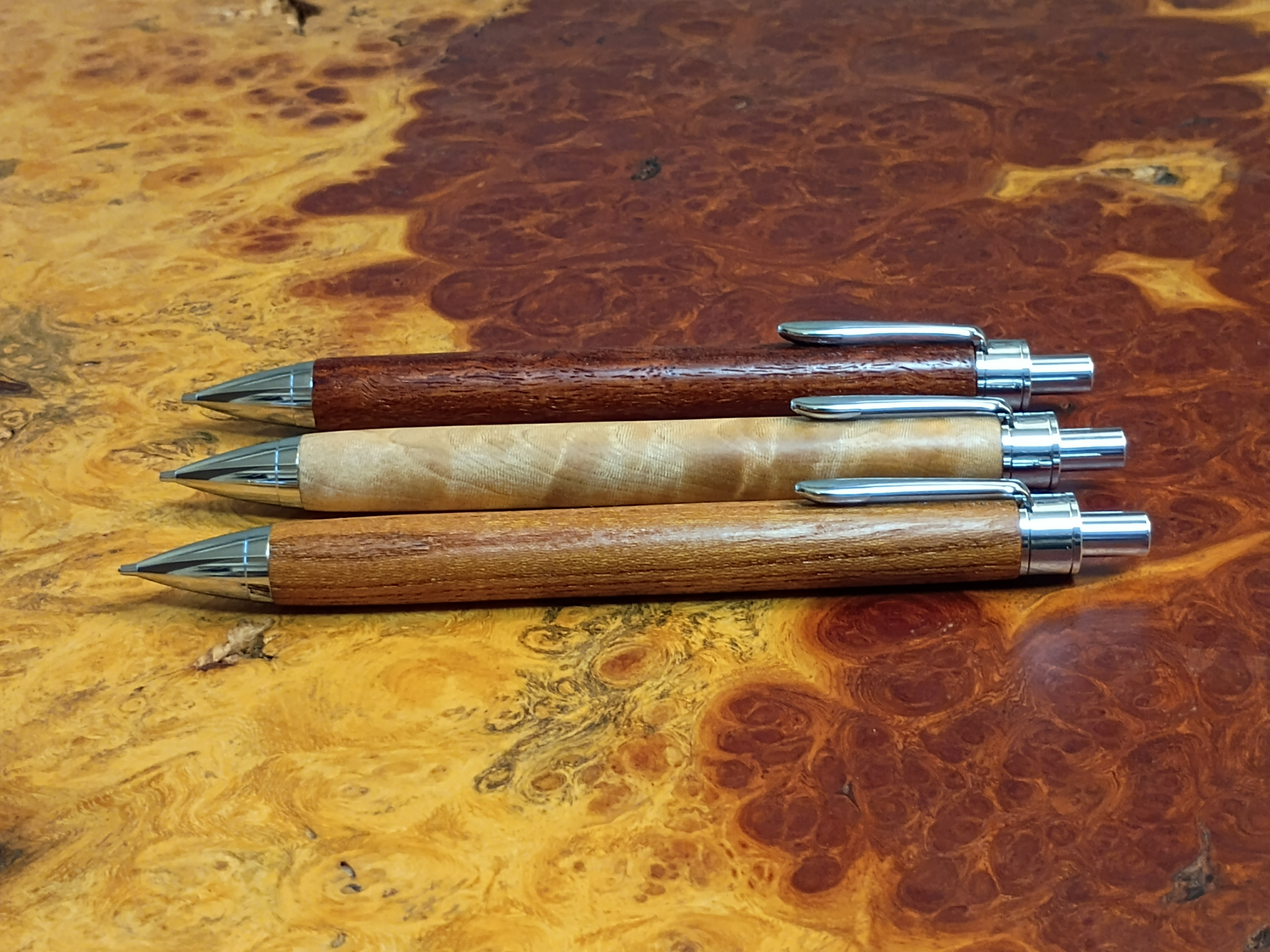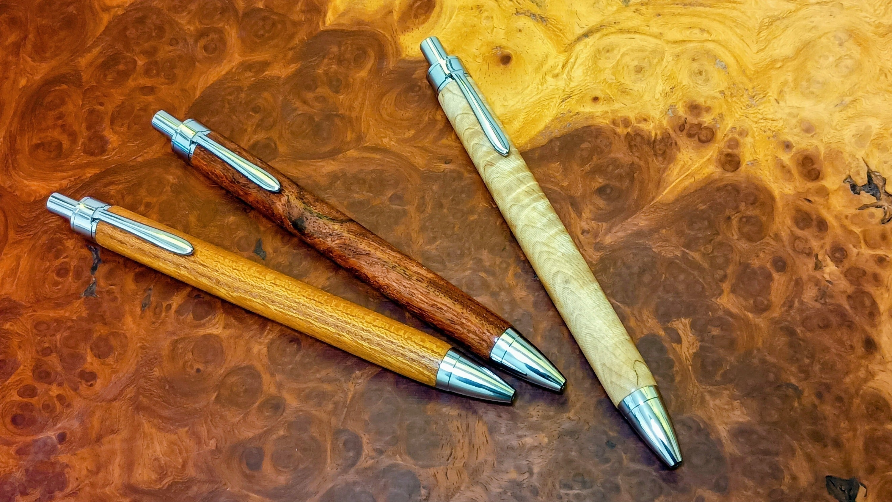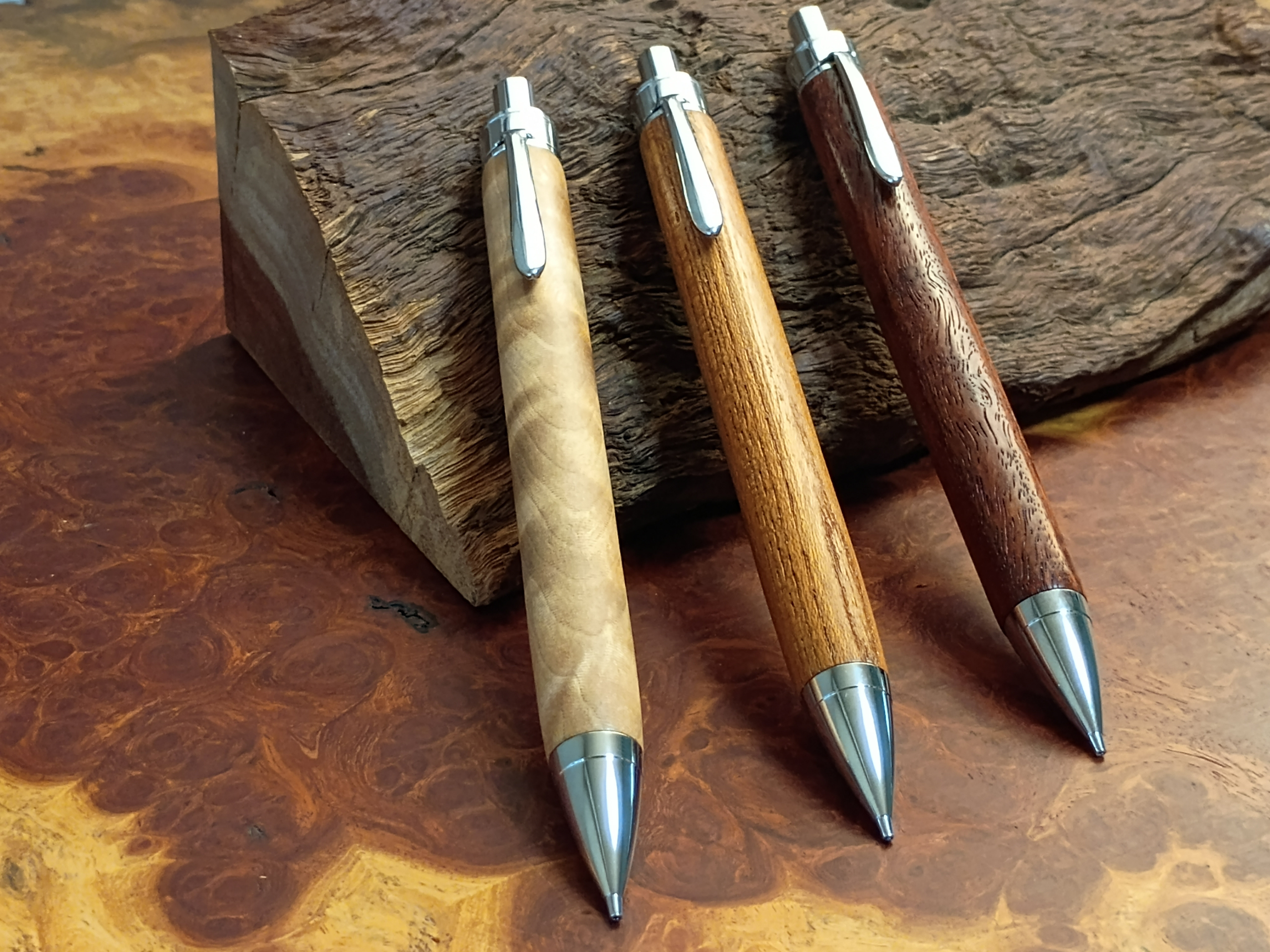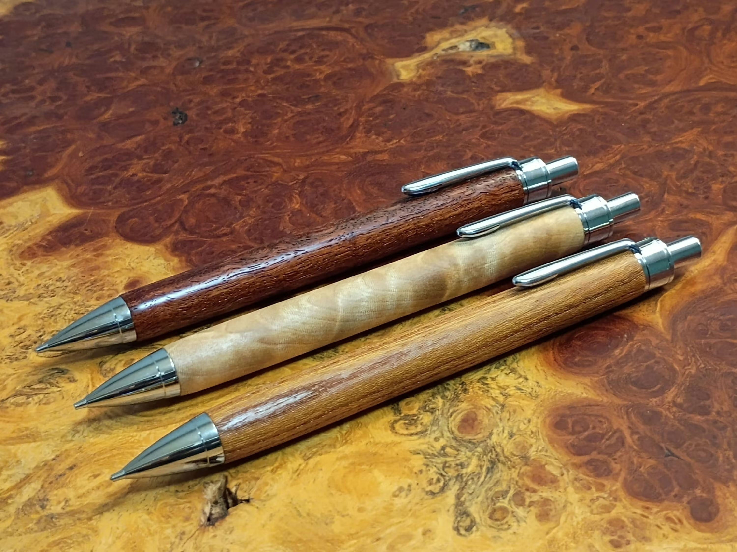 栃(とち)・花梨(かりん)・欅(けやき)のボールペン・シャーペン、全て1点ものの杢目(もくめ)をお楽しみいただけます。