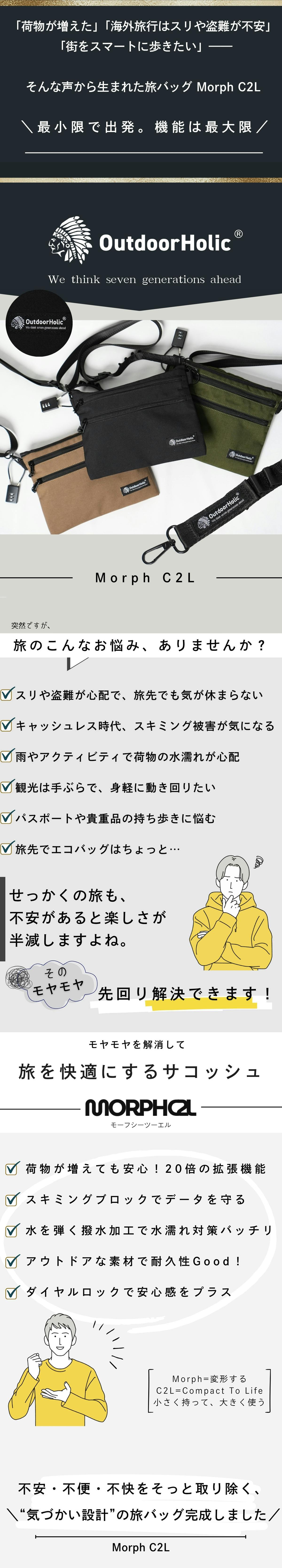 OutdoorHolicらしさを詰め込んだ旅アイテムMorph C2L(モーフシーツーエル)。国内はもちろん、海外旅行、近場のお出かけにも便利!今年のゴールデンウィークのお出かけのお供にいかがでしょうか?